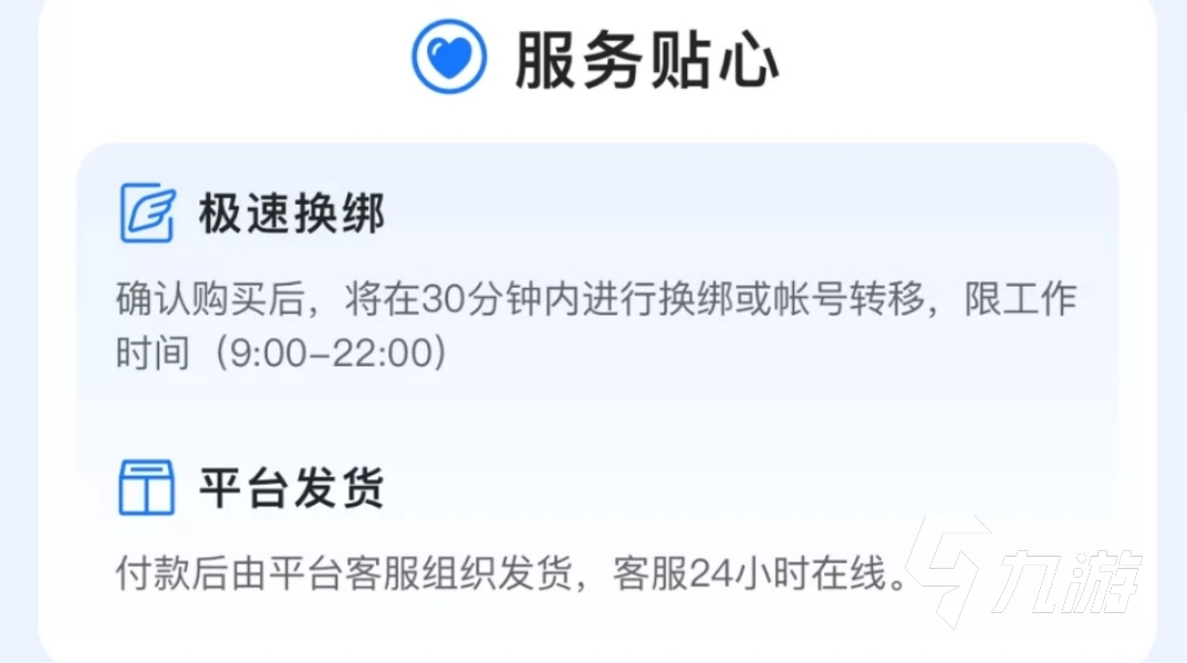 交易貓的流程很規(guī)范,并且效率也特別高,在買號的時候大家可以選擇那些支持極速轉移服務的賬號,這樣就能更快完成賬號資料轉移和綁定,讓自己快速拿到賬號。關于極速轉移的時間有嚴格的規(guī)定,在工作時間內30分鐘必須完成轉移,大家完全可以放心。
