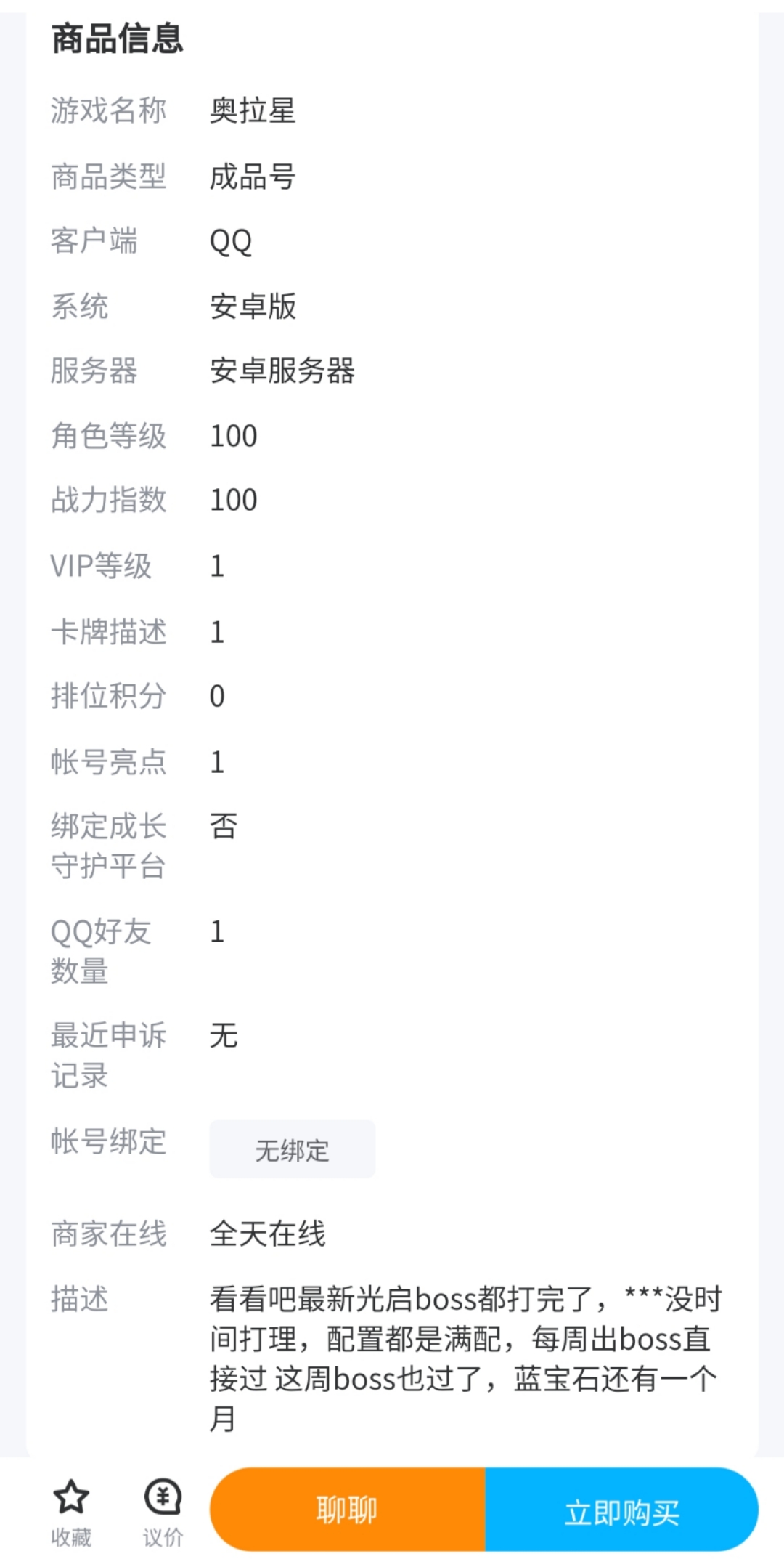 3.賬號信息詳細。在商品信息一覽里,買家可以查看賣家賬號的詳細信息。像這個奧拉星賬號,就可以看到它的系統(tǒng)和平臺,還可以看到等級,戰(zhàn)斗值數(shù)等信息。這個號的光啟BOSS打完了,配置也很高,對于想要享受滿練快感的買家來說,是不錯的選擇。如果想要快速查找到自己想要的賬號,也可以在搜索里輸入關鍵詞,快速查找到符合自己要求的賬號。賬號都是經(jīng)過官方核實過的,所以不用擔心到手之后虛標的情況。