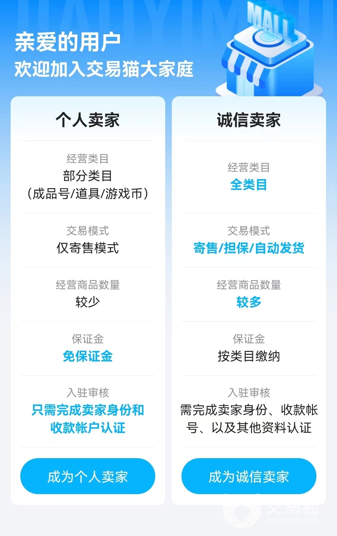 想要在交易貓中更好的出售賬號,除了個人賣家之外,還能夠申請成為誠信賣家,成為誠信賣家后擁有諸多優(yōu)勢。不僅能夠經(jīng)營各種類型的賬號交易,還可以選擇多種交易模式,所經(jīng)營的商品數(shù)量也大大增加。而且誠信賣家出售的賬號會得到優(yōu)先展現(xiàn),賬號中會有特殊標(biāo)簽,買家也會優(yōu)先選擇。如果想要長期在交易貓中從事賬號出售工作,那么這一項(xiàng)服務(wù)強(qiáng)烈建議大家選擇。