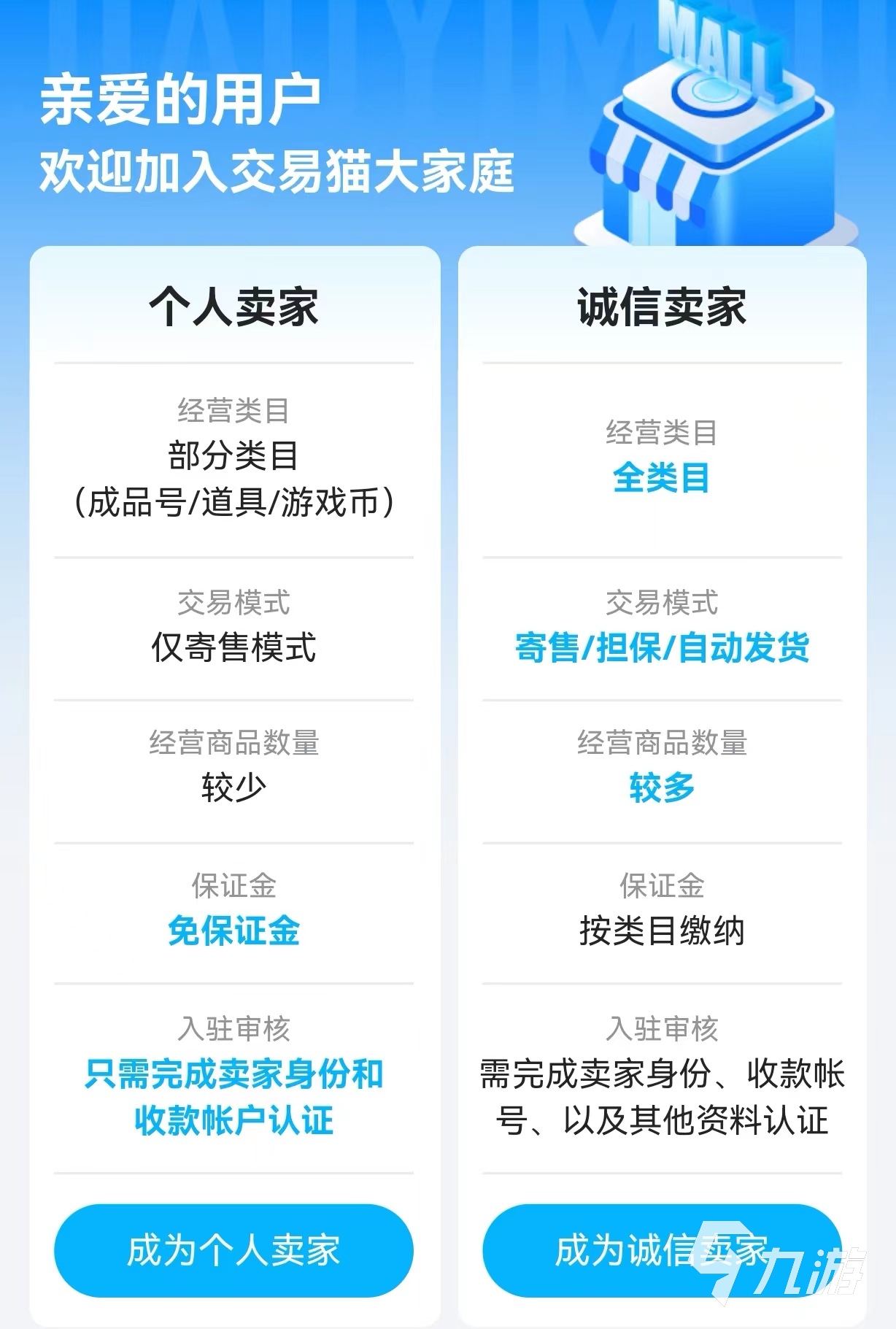 要比交易流程的便捷性必須要好好講講交易貓平臺(tái),很多平臺(tái)往往因?yàn)榉爆嵉牧鞒虅裢肆瞬簧儆脩?,交易貓從中吸取?jīng)驗(yàn),改進(jìn)后的流程新人都可以直接上手完成。在這里成為賣家的條件很簡單,只需要完成認(rèn)證和綁定支付寶就能自由的個(gè)人賣家,如果想賬號(hào)獲得更高的曝光度再追加2個(gè)條件提交保證金、認(rèn)證更多資料信息。