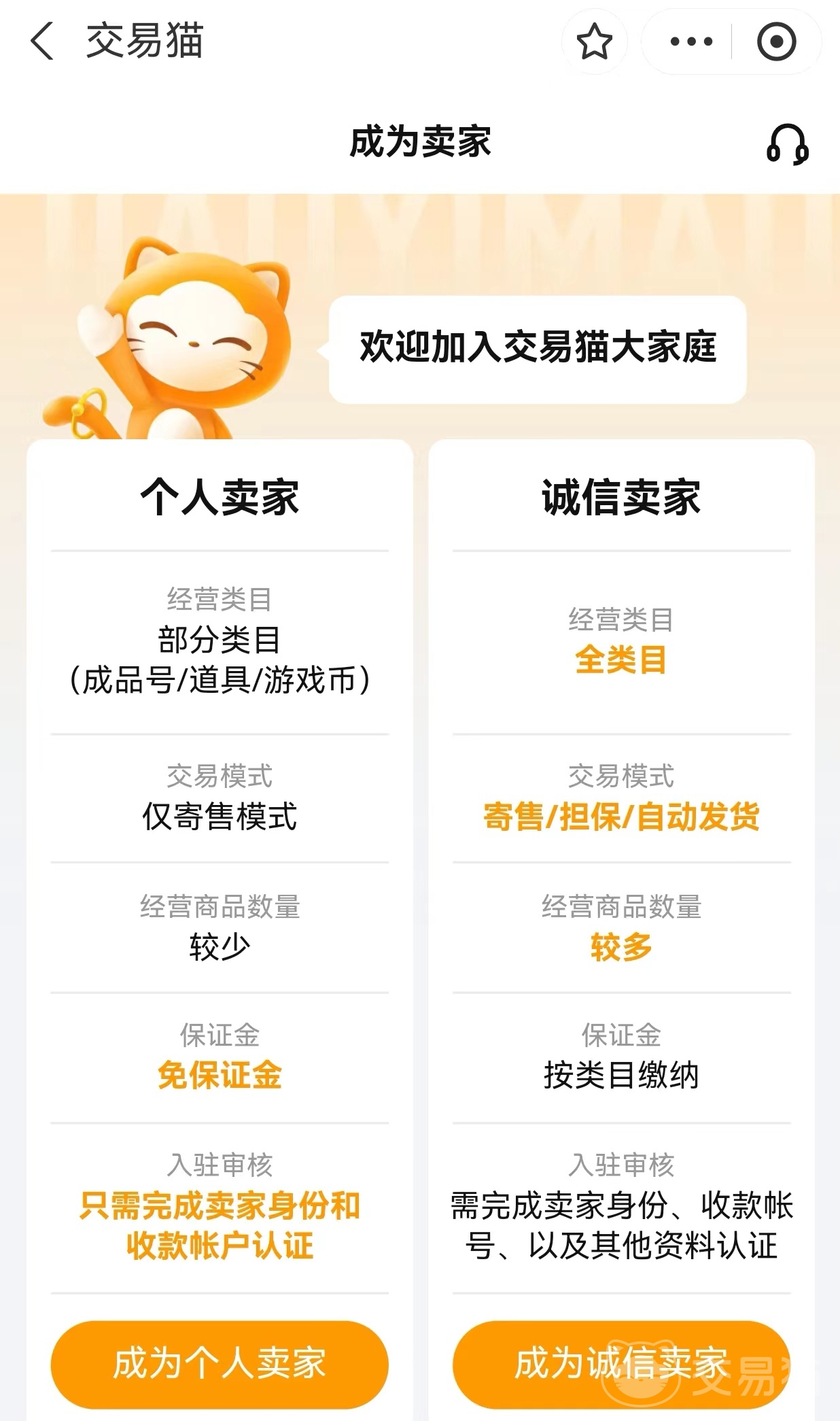 想要在交易貓平臺(tái)當(dāng)中出售游戲賬號(hào)選擇賣(mài)家身份也很重要,平臺(tái)提供的是個(gè)人賣(mài)家和誠(chéng)信賣(mài)家,誠(chéng)信賣(mài)家也就是篩選按鈕當(dāng)中的保證金賣(mài)家,誠(chéng)信賣(mài)家相比個(gè)人賣(mài)家而言,經(jīng)營(yíng)的游戲類(lèi)目數(shù)量和模式都會(huì)更多一些,而且要給平臺(tái)交納一定程度的保證金,個(gè)人賣(mài)家不需要交納保證金但是經(jīng)營(yíng)的類(lèi)目會(huì)少,小伙伴們完全可以根據(jù)自己的實(shí)際情況去考慮問(wèn)題,再去注冊(cè)自己真正需要的身份來(lái)出售賬號(hào)。