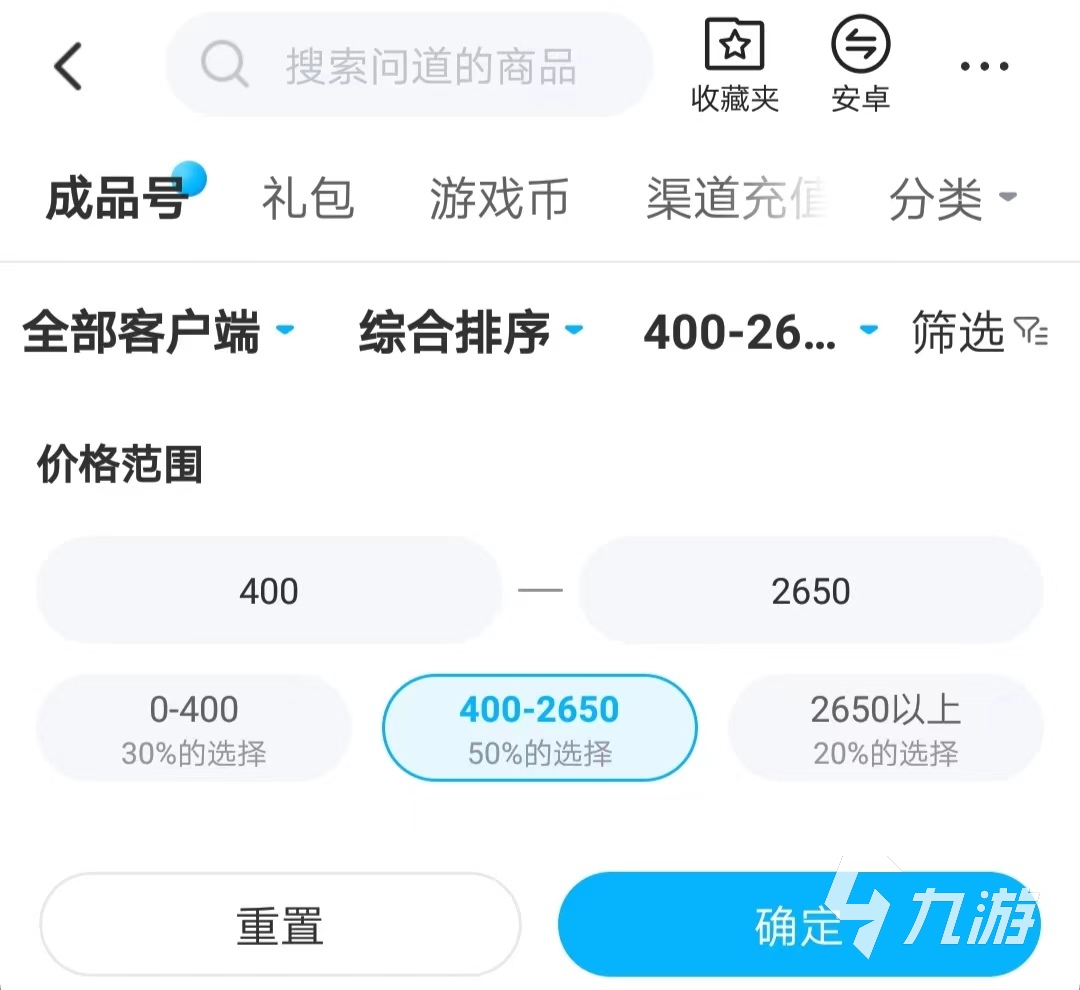 交易貓上買問道手游號-價格公道。根據(jù)小編查看,交易貓上用戶搜索問道手游比較多的價格區(qū)間在400-2000之間。價值月底和賬號內(nèi)的武器裝備和等級有關(guān),想要玩問道手游的玩家們可以根據(jù)自己的荷包能力和喜歡的職業(yè)好好篩選一下。如果選到了心怡的賬號,不過價格感覺偏高,也可以利用“議價”功能和賣家議個價。