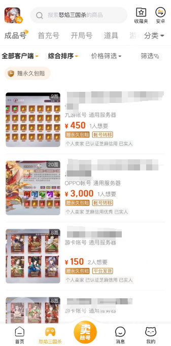 交易貓作為老牌的游戲交易平臺,匯聚了大量的怒焰三國殺賬號,覆蓋了從新手入門到高端進階的各類賬號,可以滿足不同玩家的需求。無論是初級玩家想要一個強力基礎(chǔ)號,還是老玩家想要更高等級、稀有武將齊全的賬號,交易貓都能提供豐富的選擇。平臺設(shè)置了詳細的篩選功能,玩家可以根據(jù)自己的預(yù)算、賬號的武將配置、戰(zhàn)力數(shù)值等條件,快速篩選出符合自己需求的賬號。此外,交易貓還經(jīng)常推出折扣和優(yōu)惠活動,讓玩家能夠以更優(yōu)惠的價格買到心儀的賬號。