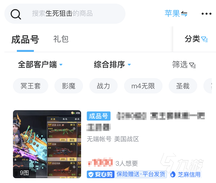 交易貓自上線開始,已經(jīng)有九年多的時(shí)間了,在這里,我們可以快速搜索到生死狙擊這款游戲,直接在首頁(yè)的搜索板塊輸入生死狙擊快速進(jìn)入游戲?qū)^(qū),能夠看到不同的游戲類別,買家的話只需要手機(jī)號(hào)快捷登錄就可以購(gòu)買,沒(méi)有任何的限制,找到自己心儀的賬號(hào)就可以快速購(gòu)買了。