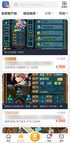 第一點(diǎn),賬號挑選余地大。qq三國交易貓專區(qū)賬號非常豐富,從59級到79級、90級、100級賬號都有,滿足不同需求的買家。賬號價格透明,售價合理。