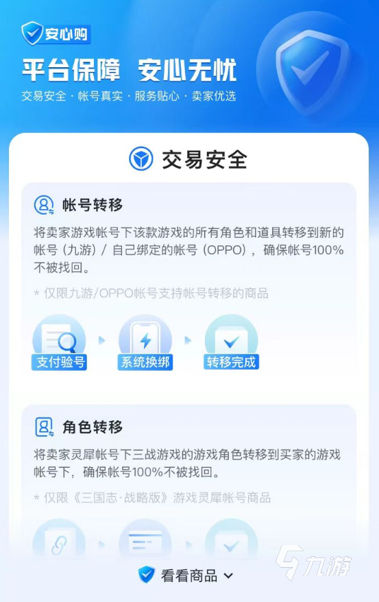 2、為了進(jìn)一步加強(qiáng)交易的安全性,平臺(tái)的安心購保障服務(wù)的開通,會(huì)直接幫助玩家們遠(yuǎn)離各種不安全的交易因素。大家在挑選交易商品的時(shí)候,就可以關(guān)注一下商品是否包含了該服務(wù),大家也可以直接當(dāng)做一個(gè)可以進(jìn)行交易的參考信息。
