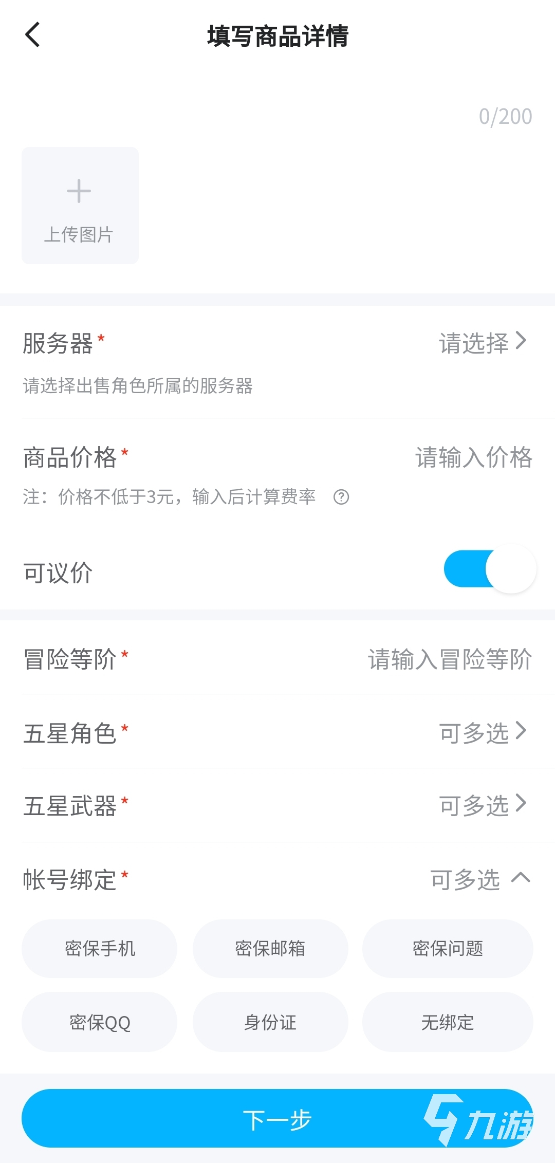 通過便捷的估價功能,上架前的其中一環(huán)就完成了。此外賣家們在上架前,還得對賬號作一個全面的介紹,交易貓在這一環(huán)節(jié)也提供了很多助力,平臺針對原神這款游戲設(shè)計了一套介紹模板,把游戲內(nèi)的角色、武器都變成了選項,我們只需點擊選一選就行。