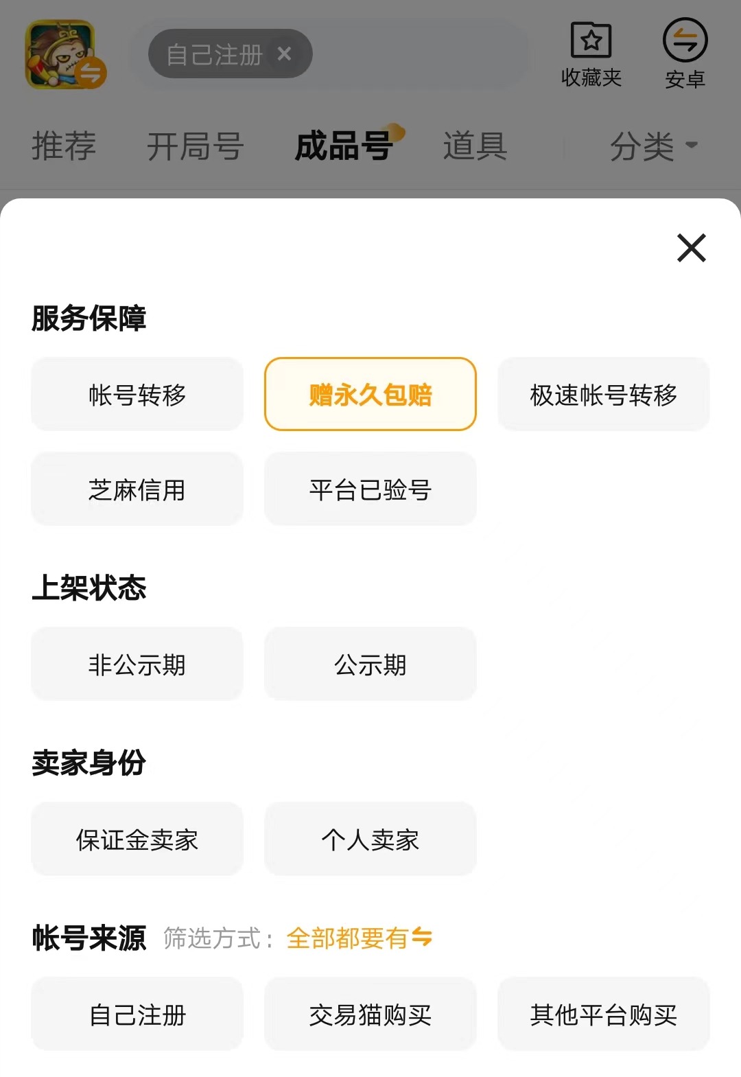 想要買號的玩家想好了要買什么角色的賬號或者對游戲賬號有什么要求又想要迅速買到滿足自己需求的賬號那么就在游戲賬號列表上進行【篩選】,這個游戲賬號內(nèi)可以篩選的內(nèi)容具體如下圖所示,在篩選上小編建議把【贈永久包賠】選擇上,這項服務(wù)能夠保障買家的權(quán)益。只要是在交易貓上完成的賬號交易無論交易完成多久時間一旦賬號被找回,平臺承擔(dān)買家交易的損失。
