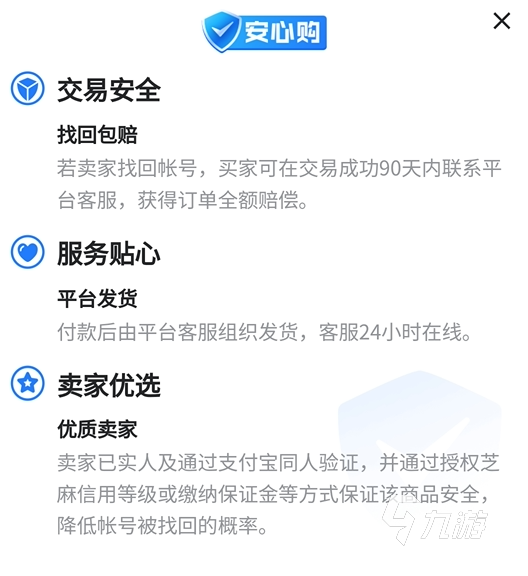 為了減少買家的風(fēng)險(xiǎn)它還貼心推出了安心購等多種服務(wù),買家在賣號之前需要實(shí)名認(rèn)證自己的信息,不誠信的賣家早早就被篩選了出去。購買了安心購服務(wù)的賬號還能找回包賠,切實(shí)保證玩家的權(quán)益。