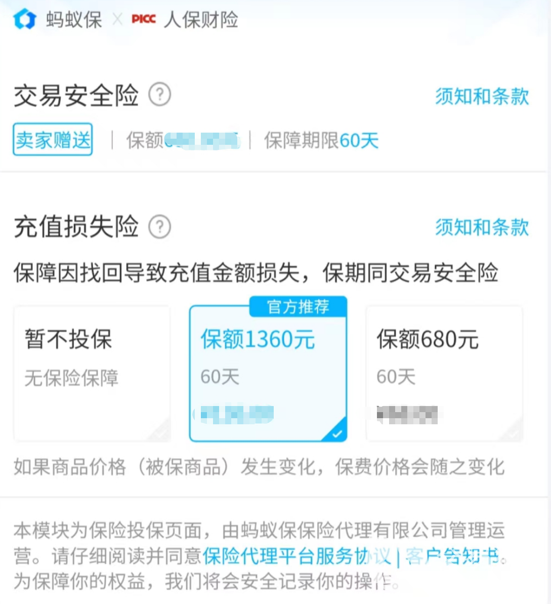 交易貓內(nèi)購(gòu)買(mǎi)商品時(shí)可以看到還有一部分會(huì)贈(zèng)送保險(xiǎn),這一部分是無(wú)需大家自己去花錢(qián)購(gòu)置的,要是認(rèn)為不穩(wěn)妥的話(huà)是可以再基于原始價(jià)格進(jìn)行二次保險(xiǎn)購(gòu)買(mǎi),保險(xiǎn)的來(lái)源公司也都是正規(guī)、權(quán)威的,投保之后賬號(hào)就相當(dāng)于有了基礎(chǔ)的“安心購(gòu)”以及雙層保險(xiǎn),在保險(xiǎn)時(shí)效的選擇上天數(shù)也足夠靈活。