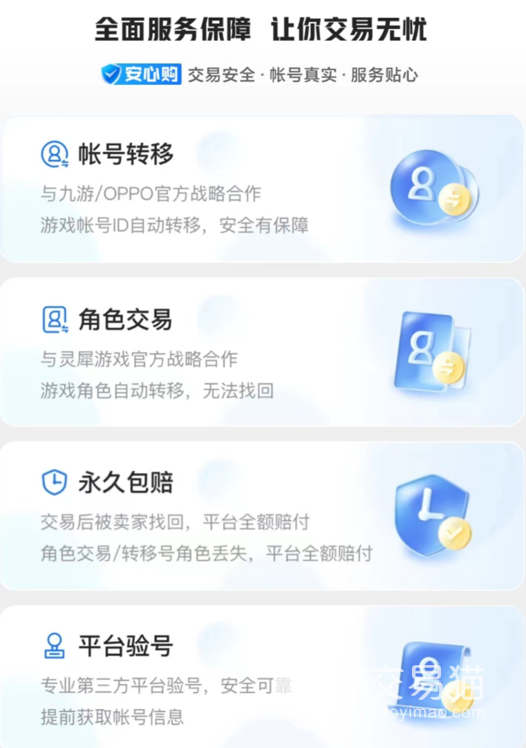 在專(zhuān)區(qū)內(nèi)映入眼簾地就是“安心購(gòu)”標(biāo)志,這項(xiàng)服務(wù)它不只是單獨(dú)的包賠條款,而是有多項(xiàng)專(zhuān)門(mén)用于針對(duì)交易安全的條款,但要注意的是并非是全部商品都享受這項(xiàng)服務(wù),而且基本都是誠(chéng)信比較不錯(cuò)的商家才能獲得平臺(tái)贈(zèng)與,賬號(hào)被出售后就相當(dāng)于進(jìn)入了保護(hù)期,當(dāng)時(shí)服務(wù)于你的售后專(zhuān)業(yè)客服將會(huì)一直負(fù)責(zé)到底,且部分商品除了帶有包賠政策之外還能看到其余的一些安心購(gòu)服務(wù)款項(xiàng)。