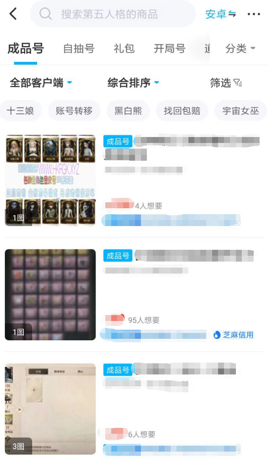 3、當(dāng)然對于不同游戲需求的玩家而言,也可以使用交易貓來獲取自己滿意的高級賬號。在第五人格的專區(qū)內(nèi),大量高級賬號交易信息可以快速進(jìn)行查看,玩家們可以輕松了解到每一個賬號所包含了哪一些角色,利用這些對比來進(jìn)行在線下單。