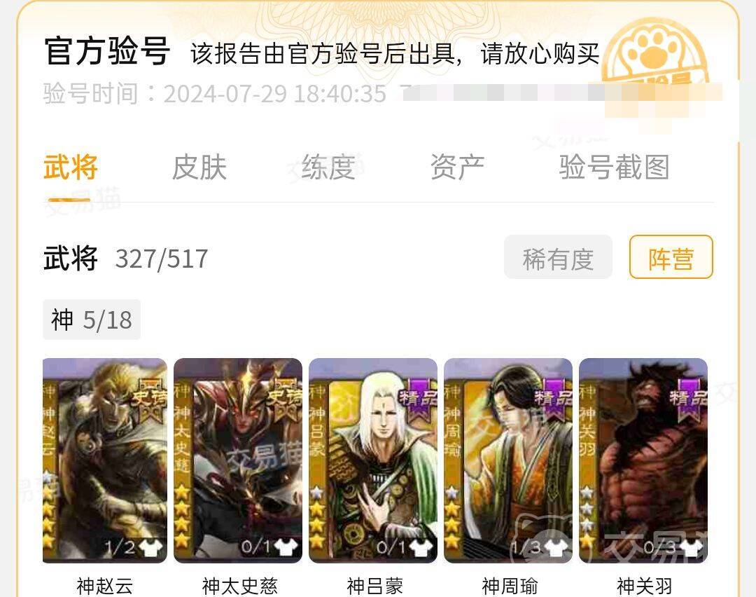 三國殺算是交易貓中交易額比較龐大的一款游戲,可以專門針對里面的賬號資源信息進(jìn)行了規(guī)整分類。玩家可以通過武將皮膚練度資產(chǎn)和截圖等等最快程度的了解某個賬號的信息,在付款之前就能知道這個賬號所擁有的元寶將魂等等。驗號報告都是官方交易員親自根據(jù)賣家所提供的賬號密碼登錄游戲進(jìn)行截取的,所以可靠性拉滿。