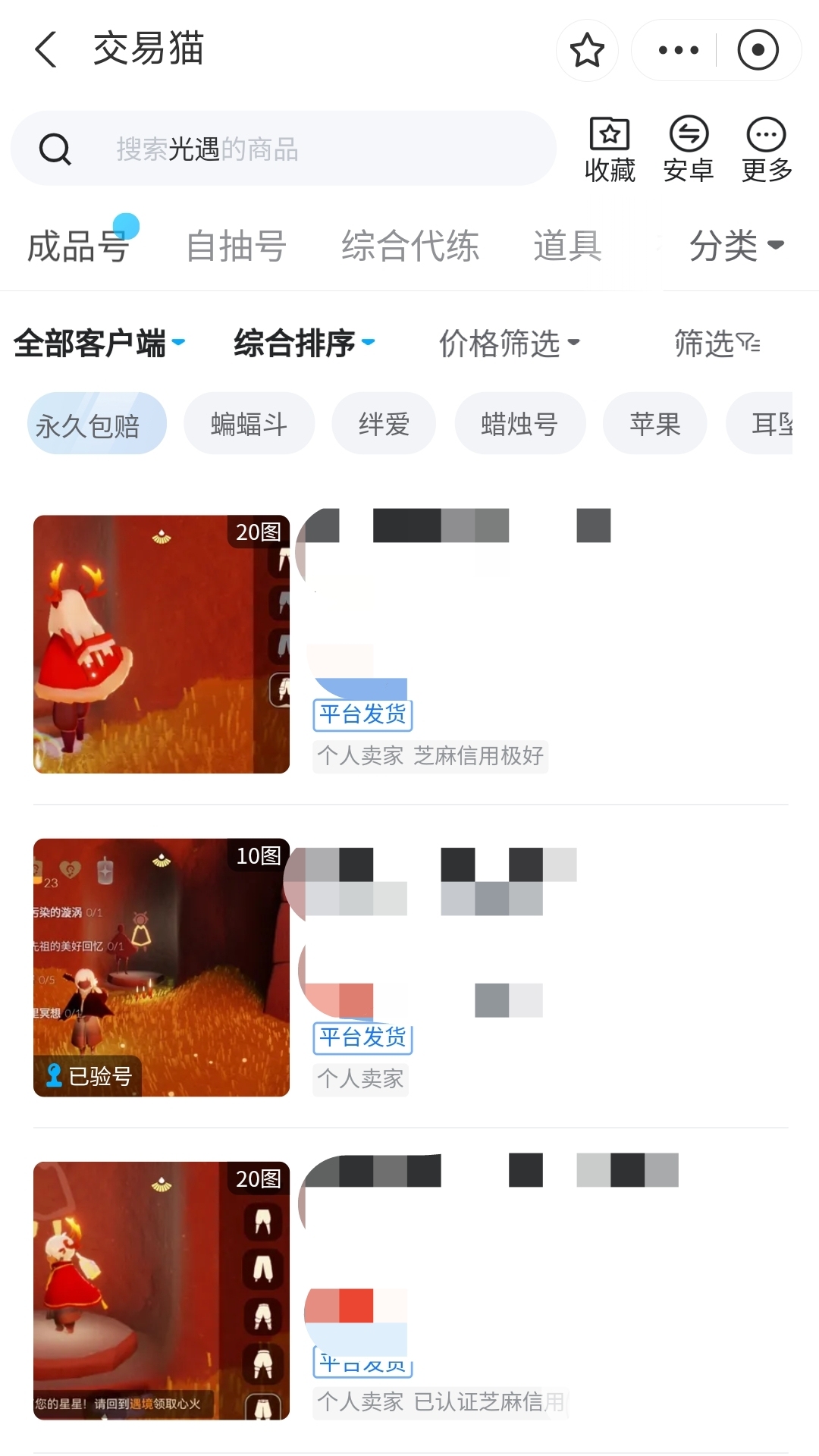 關(guān)于光遇全物品號的價格,小編無法提供具體數(shù)字。但是,我強烈建議玩家前往交易貓平臺親自選購光遇全物品號。在該平臺上,可以查看多位玩家發(fā)布的報價,并根據(jù)不同的限定物品來判斷賬號價格。如果你對此感興趣,請點擊上方的下載鏈接進(jìn)入交易貓平臺!