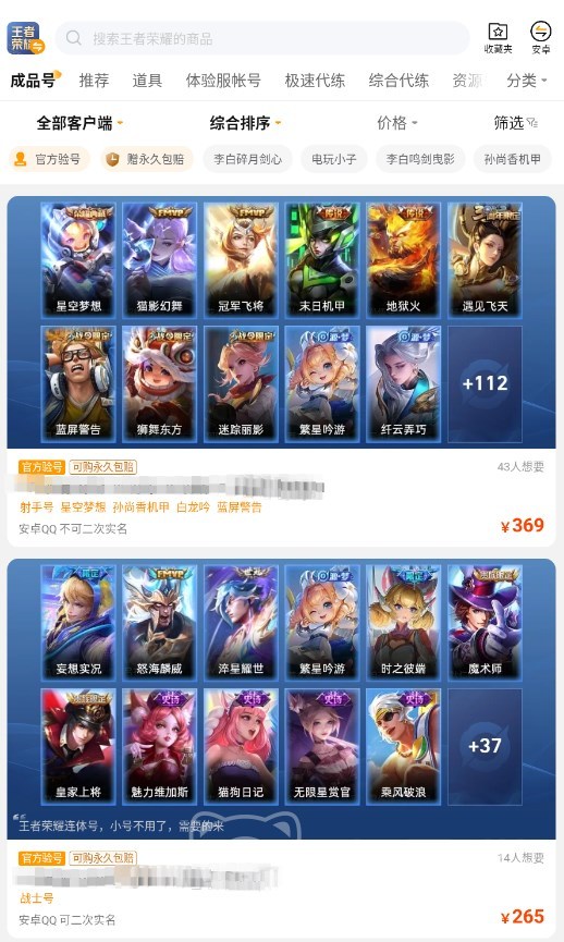 而對于怎么估算賬號價格,目前交易貓支持對原神與和平精英的免費估值,如果想看自己的王者游戲賬號能賣多少錢,可以考慮王者商品專區(qū)內(nèi)對比其他賣家的商品,這樣就可以做到心中有底,不至于賣虧了。