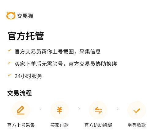 有的玩家也想在自己不玩的時候?qū)①~號出售回點血,但阻礙他們完成這個想法的一個原因就是“嫌麻煩”,使用交易貓的話就不會有這個煩惱,只需點擊最下方的“賣”,然后利用“官方托管”就可以將賬號交給官方人員來幫你上號截圖采集信息,這樣買家付款然后官方協(xié)助換綁,剩下的就是坐等收款了。