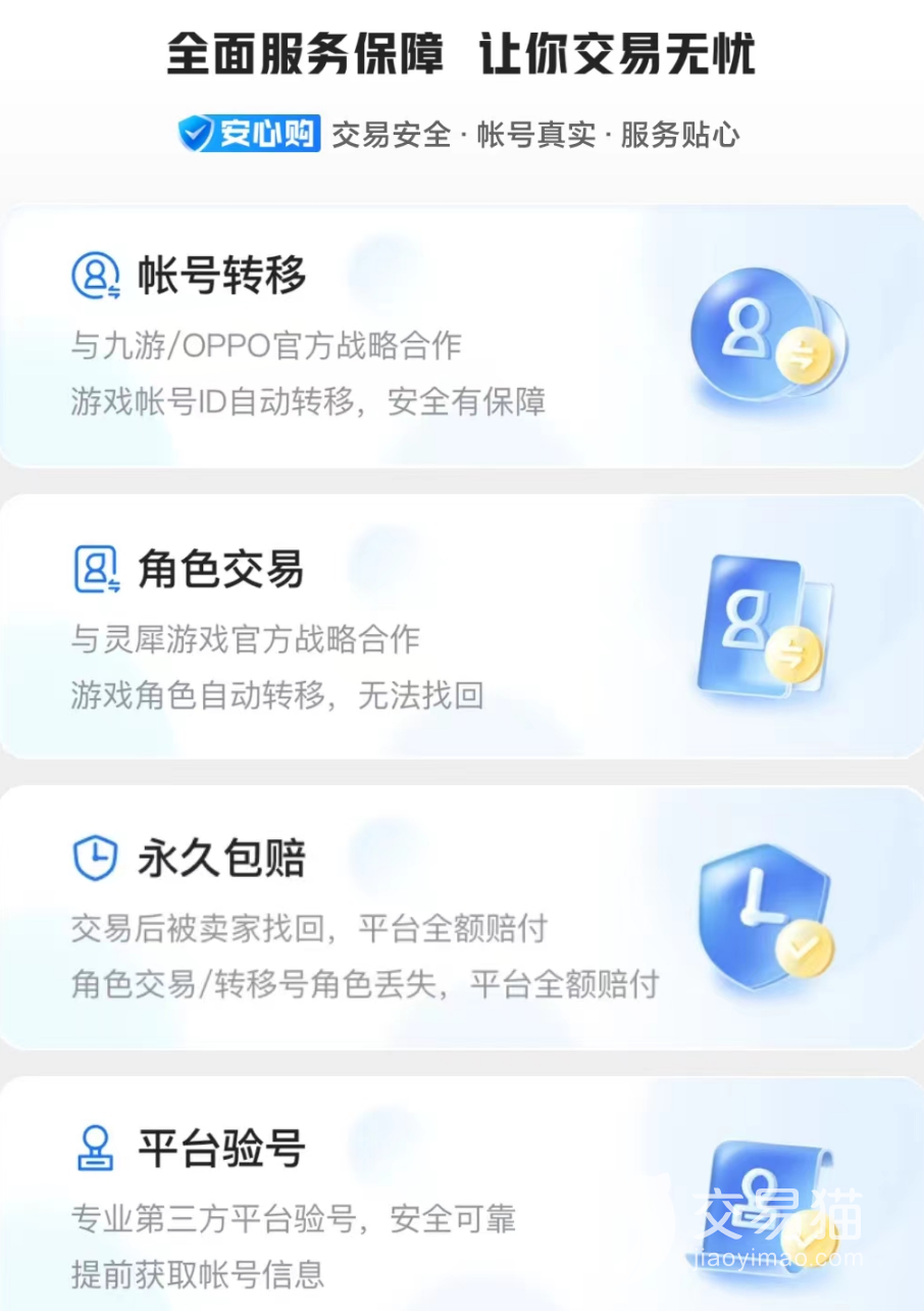 交易貓在安全方面的保障方法也很直白,那就是去給你贈送保險,有部分賬號還會有一個特殊的安心購選項,每個安心購政策里面的內(nèi)容都不同,但它們相同的點就是可支持找回包賠的服務(wù),能讓用戶在很長一段時間內(nèi)無需擔(dān)心被找回的問題,要是說發(fā)生找回也是貫徹了先賠款后尋回的理念,確保用戶是不會在售后期間出現(xiàn)時間和經(jīng)濟的受損。