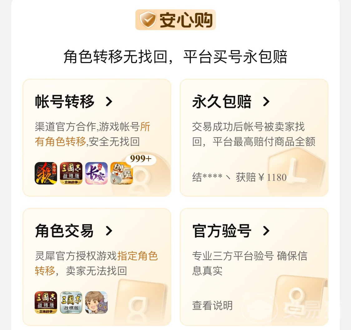 保障規(guī)則多。該平臺(tái)服務(wù)保障項(xiàng)目多,囊括了芝麻信用認(rèn)證、實(shí)名認(rèn)證、官方驗(yàn)號(hào)、永久包賠、賣家保證金抵押等。玩家在搜索賬號(hào)時(shí),設(shè)定相關(guān)的條件,快速找出誠(chéng)信度更高的優(yōu)質(zhì)賣家,規(guī)避交易風(fēng)險(xiǎn)。