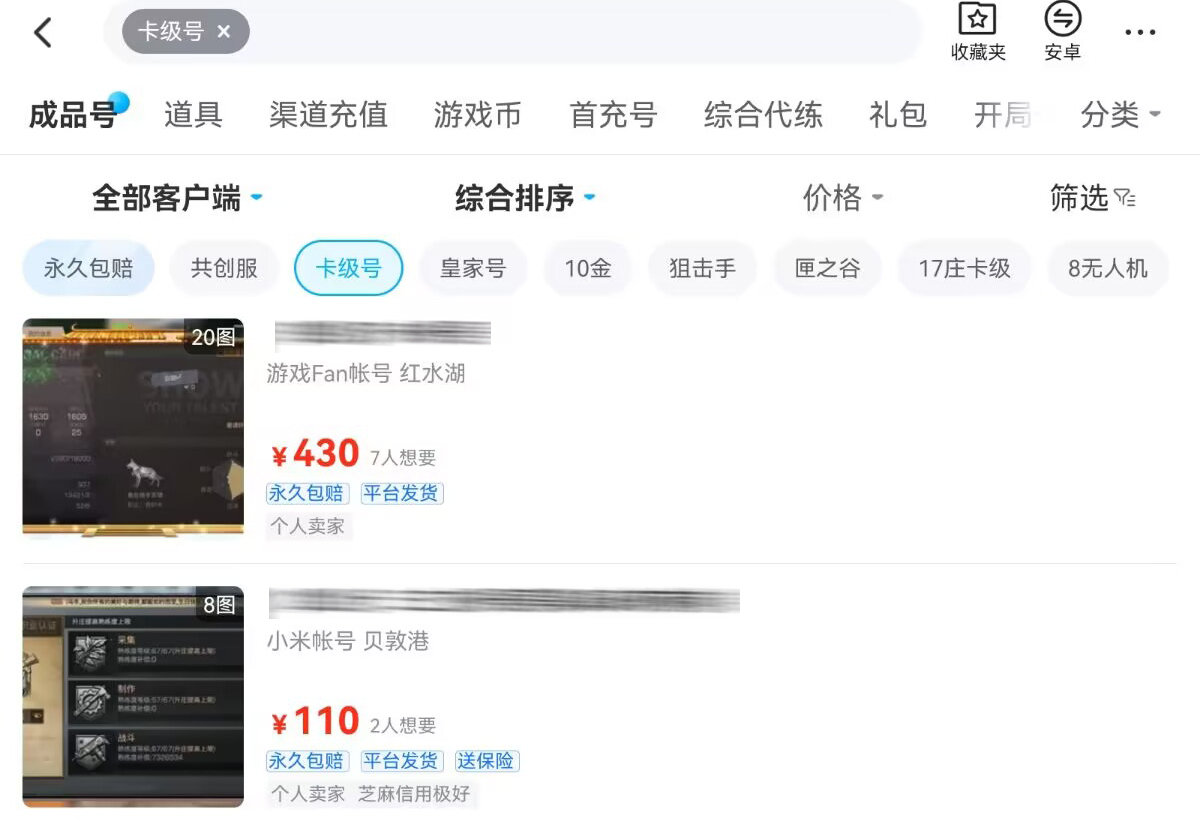 因?yàn)檫@款游戲的競(jìng)技性比較強(qiáng),所以會(huì)衍生出不同風(fēng)格的賬號(hào)。賣家們可以根據(jù)自己的賬號(hào)特色將賬號(hào)的某一個(gè)特點(diǎn)展示出來(lái),例如卡級(jí)號(hào),可以將你的等級(jí)卡到一個(gè)范圍內(nèi),然后有需要買的朋友也可以直接點(diǎn)擊卡級(jí)號(hào)這個(gè)選項(xiàng)就能快速找到相關(guān)賬號(hào)。另外還有其他角色號(hào)以及道具號(hào)都可以選擇。