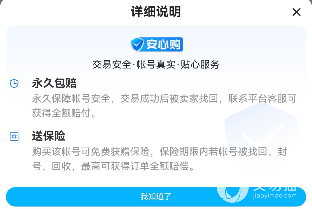 有的賣家為了進(jìn)一步獲取買家的信任,就特地為他們買了一份保險(xiǎn),也就是平臺(tái)里面的安心購(gòu)服務(wù),當(dāng)然這種商品僅為部分提供。這時(shí)候如果你在玩游戲的過(guò)程中賬號(hào)出現(xiàn)問(wèn)題,最多可以獲得購(gòu)買時(shí)價(jià)格的賠償額度,這樣買的時(shí)候就不用擔(dān)心被人坑害。