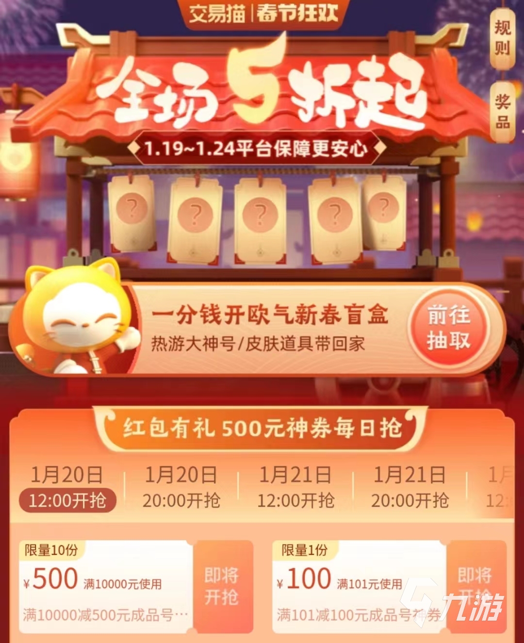 正值春節(jié)期間,平臺還推出了新春狂歡,在狂歡活動里可以免費抽獎也能免費領(lǐng)取優(yōu)惠券,大家只要蹲點就有機會領(lǐng)到大額券。有了優(yōu)惠券下單就能更便宜了,只要達到抵扣金額就能直接減錢。