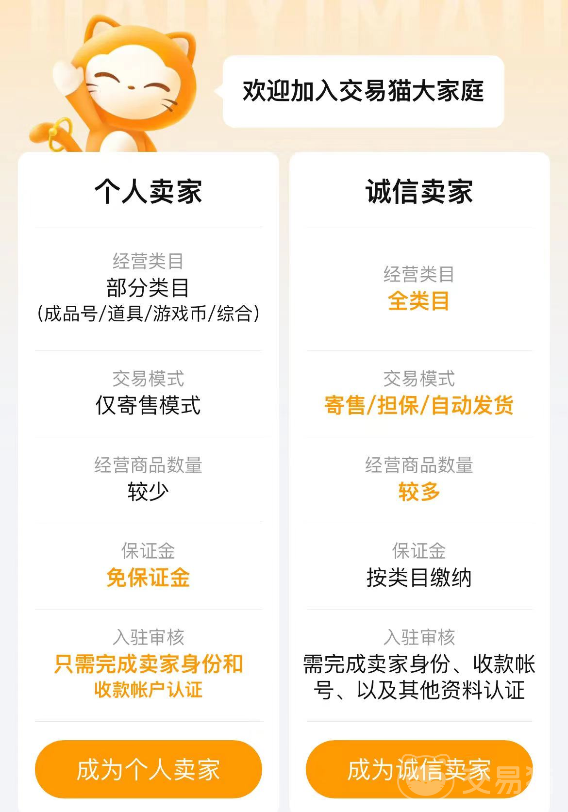 成為平臺賣家十分簡單,只是打算出售閑置賬號的小伙伴只要選擇個(gè)人賣家身份就可以了,如果想要長期經(jīng)營游戲相關(guān)交易則可以選擇保證金賣家,保證金賣家擁有的權(quán)限以及享受的福利更多,可以賣出的商品范圍也更大。