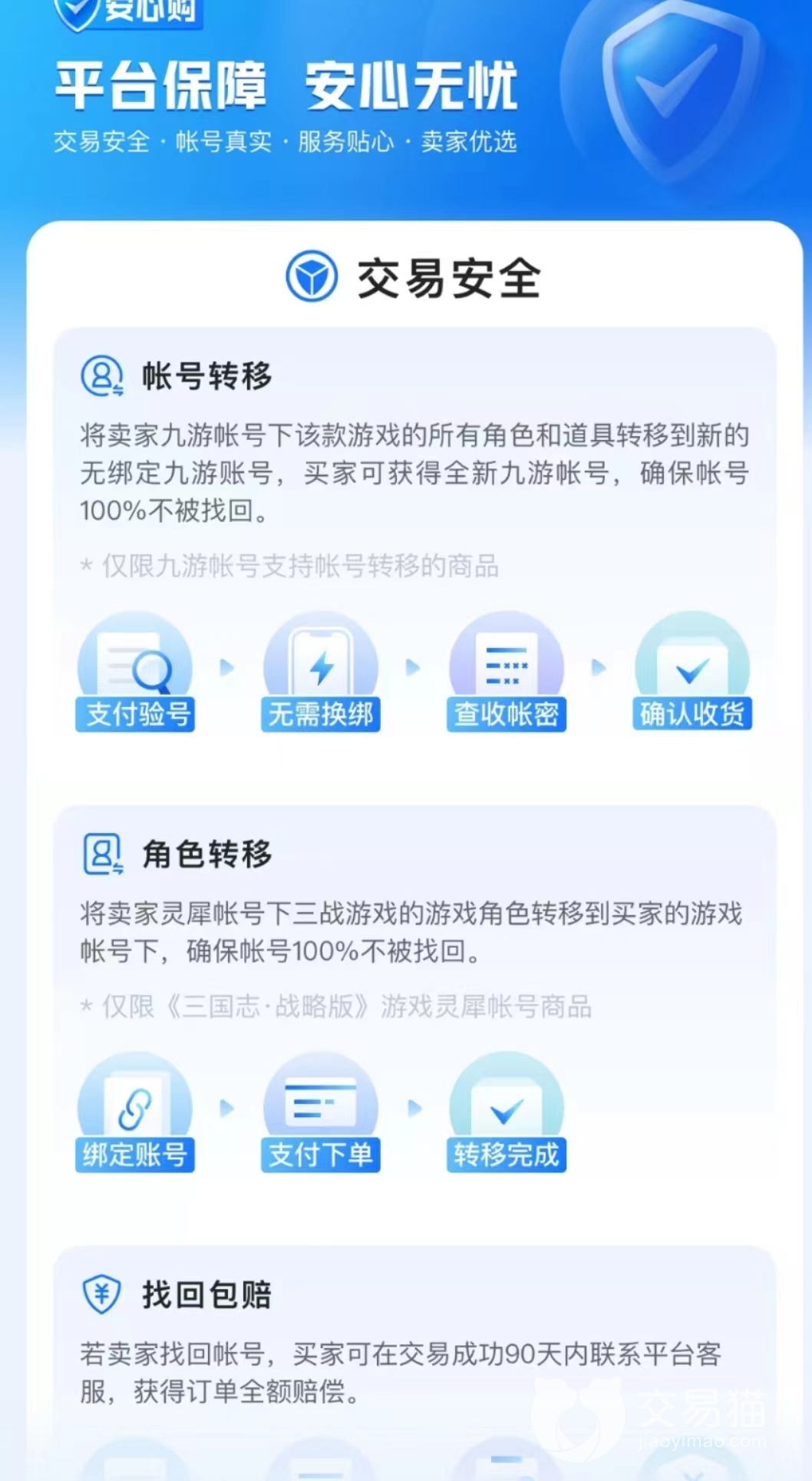 對于一個賬號交易平臺而言,除了各種優(yōu)惠活動和買賣號種類之外最最最重要的便是賬號安全,很多人愿意來平臺上購買賬號也是出于安全性的考慮。首先就是官方對賣家賬號認(rèn)證,讓買家放心的同時也能讓賣家賬號獲得更大的曝光度。同時平臺還支持找回包賠以及極速換綁等多個安全措施,保障你賬號買的放心,用的舒心,一定程度防止了無良賣家找回賬號。