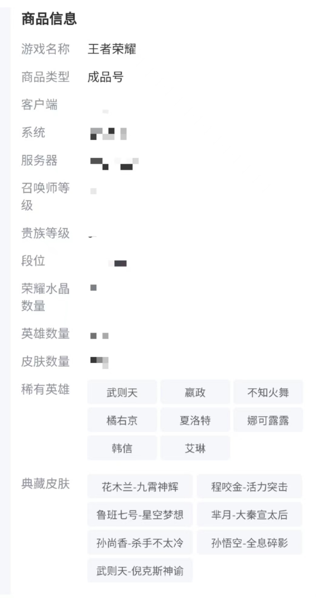 當(dāng)我們在賬號平臺上找到自己喜歡的賬號時點擊進去,就能看到這個賬號的所有信息了,皮膚數(shù)量、金幣數(shù)量、英雄數(shù)量、藏品數(shù)量、排名、戰(zhàn)力等等數(shù)據(jù)都一覽無余,這樣我們就能很快得知賬號是否滿足我們的要求啦。