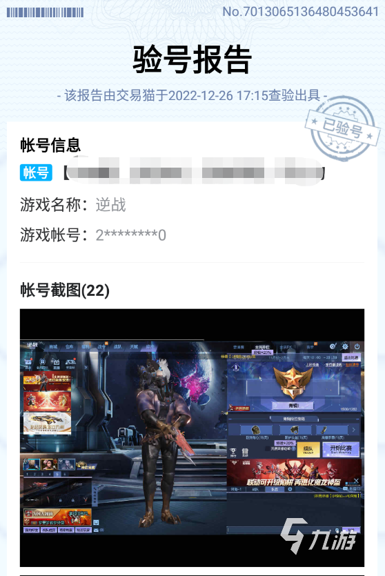 作為買家,最擔(dān)心賬號(hào)收到之后貨不對(duì)版,而如果選擇用交易貓就沒(méi)有這個(gè)煩惱。因?yàn)榻灰棕埰脚_(tái)上面的賬號(hào)信息都有多維度展示賬號(hào)的截圖,部分賬號(hào)還有官方驗(yàn)證的驗(yàn)號(hào)報(bào)告,點(diǎn)擊平臺(tái)驗(yàn)號(hào)報(bào)告的標(biāo)簽,可以查看賬號(hào)大量的游戲截圖,角色等級(jí)、裝備、槍械、道具、皮膚等一目了然。
