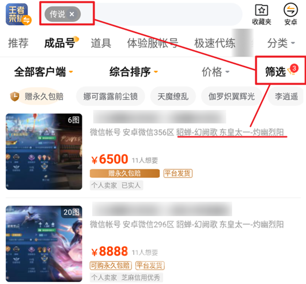 我們先來看看手動估價的方法,這個方法比較貼近當前的市場規(guī)律和定價,算出來的價格還是比較準確的。我們進入到王者的成品號交易專區(qū)中,從全部客戶端中選擇好對應(yīng)的賬號、系統(tǒng)版本,區(qū)服倒不是太有所謂。此時我們點擊右側(cè)的篩選,然后勾選自己擁有的各個品質(zhì)皮膚。到這里還沒有結(jié)束,我們還能夠在上方鍵入一些關(guān)鍵詞來搜索,比如英雄和皮膚的數(shù)量之類的。這樣我們篩選出來的商品跟自己的賬號條件就差不多了,價格參考也會更加精準。