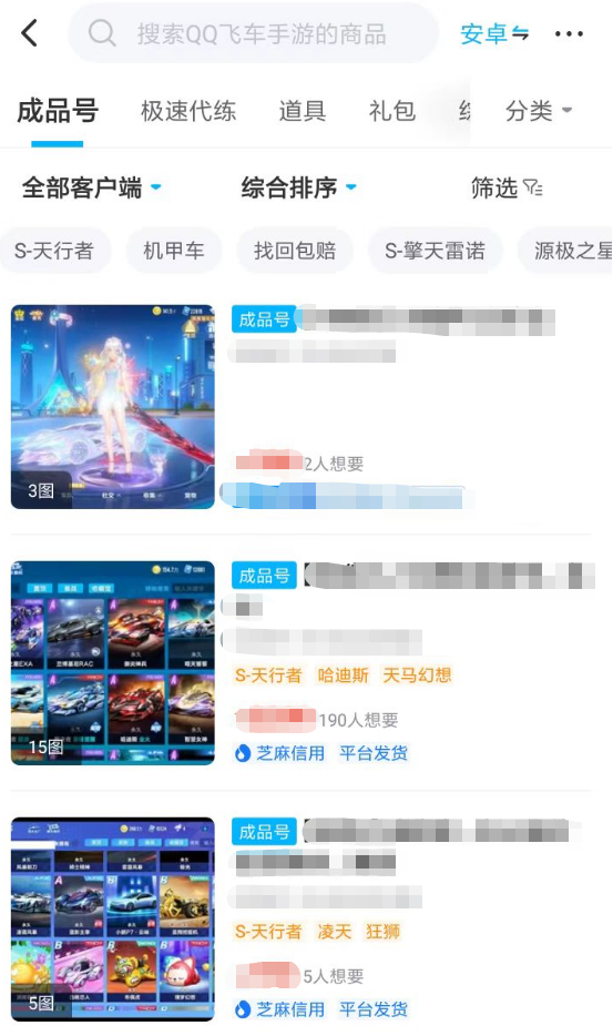 3、而玩家們所發(fā)布的交易內(nèi)容,就會直接展示到QQ飛車手游的交易專區(qū)當(dāng)中。在這里各位可以瀏覽到大量游戲賬號的交易信息,當(dāng)其他買家對玩家發(fā)布的商品感興趣時(shí),就可以通過在線下單的方式來開啟交易。