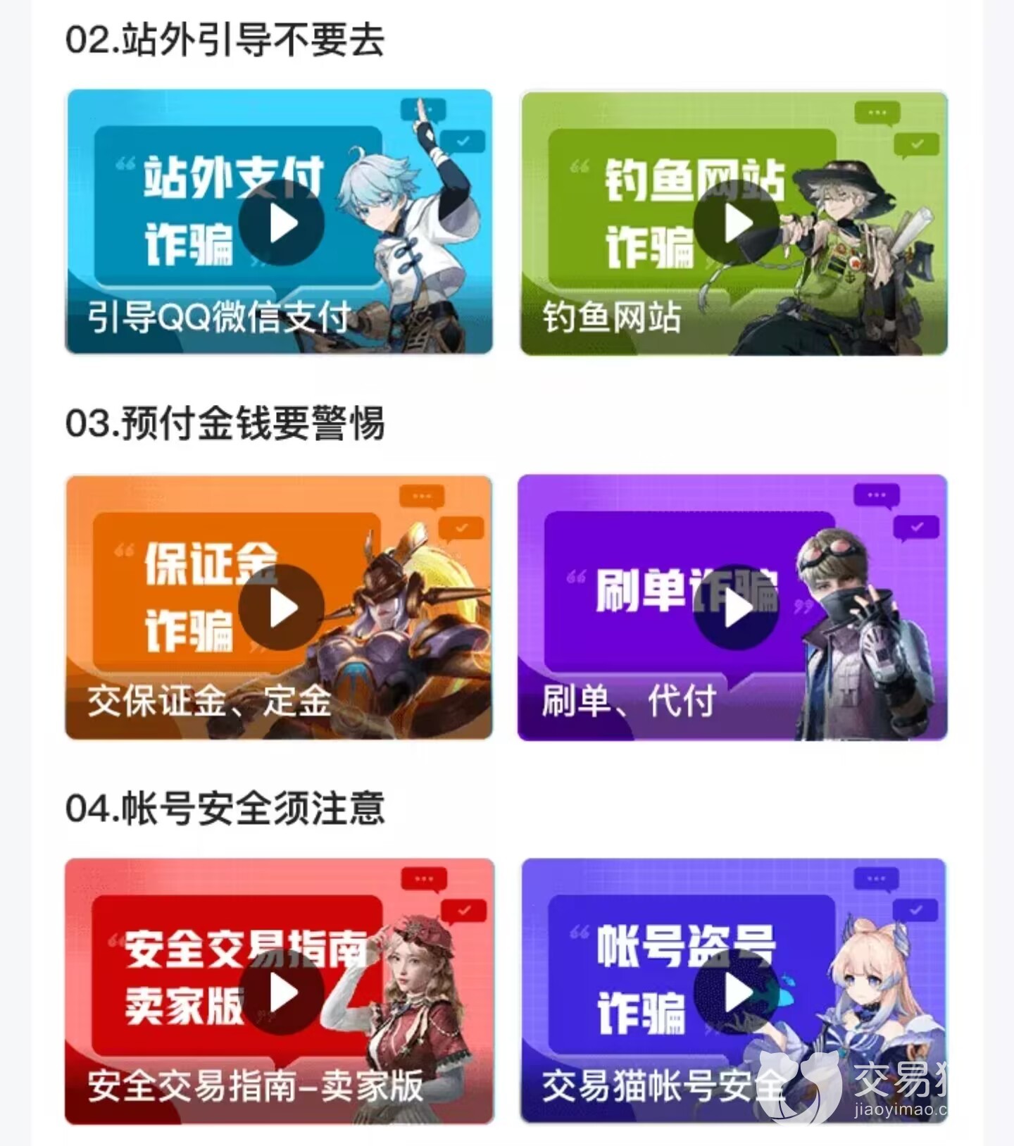 小編上面提到的這兩個途徑,第一個途徑可以說安全性是有很大問題的,所以在保障安全性的方面,交易貓做的非常好。首先,從最基礎(chǔ)的方面,它提供了安全學(xué)堂,可以在上面學(xué)到一些防騙知識,這些知識雖然看起來不多,但是已經(jīng)完全可以應(yīng)對,平時在平臺中的交易安全需求,通過學(xué)習(xí)這些可以大大提高我們的防范性,從而避免被一些不良買家騙取賬號。