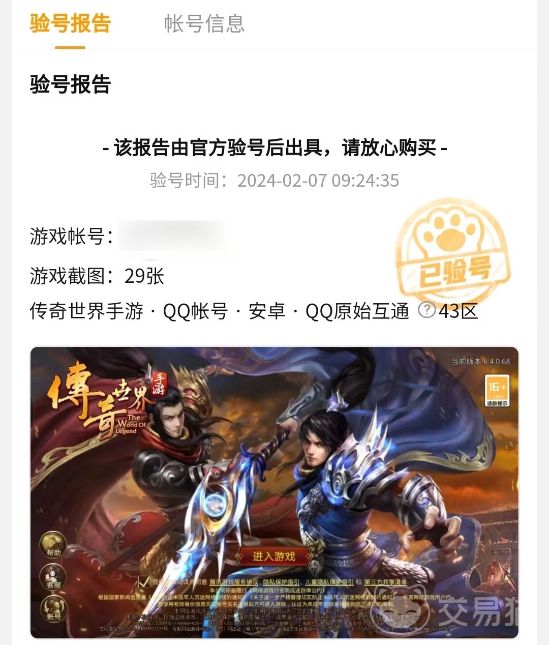 游戲的交易和實物交易畢竟不一樣,實物商品只要不影響二次銷售一般來說都能進(jìn)行退換,游戲賬號這類非實物的交易就不適用這個規(guī)則了,但是對于賣家而言怎么證明自己賬號的真實性,買家怎么相信賣家所描述的賬號詳情。在交易貓上賣家可以提供賬號來經(jīng)過驗證,經(jīng)過驗證的賬號會有驗號報告和驗號編號。