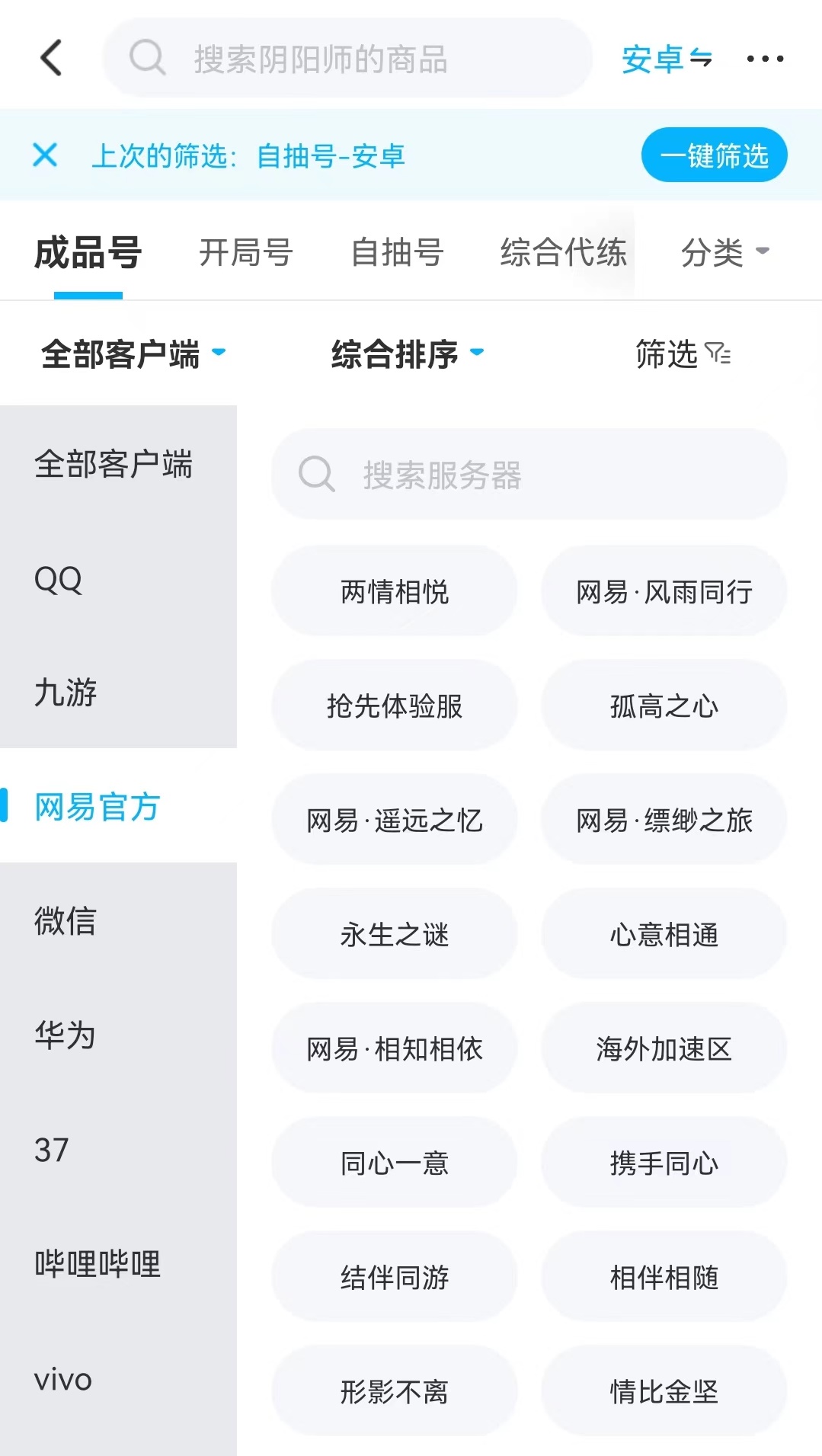 在交易貓中的陰陽師專區(qū)里,有著各個(gè)服務(wù)器的海量賬號商品等待大家去挑選,要想在其中找到體驗(yàn)服,可以從全部客戶端中搜索。找到網(wǎng)易官方服務(wù)器后,在其中就能看到有搶先體驗(yàn)服的選項(xiàng),選中之后所篩選出來的所有賬號商品,就是體驗(yàn)服中的內(nèi)容。在其中還可以繼續(xù)通過篩選服務(wù)選擇自己喜歡的式神、角色等級,賬號類型、SSR、SP數(shù)量等一系列問維度,進(jìn)行再次選擇。這樣篩選出來的就是最符合要求的那一小部分,方便后續(xù)繼續(xù)逐個(gè)查看。