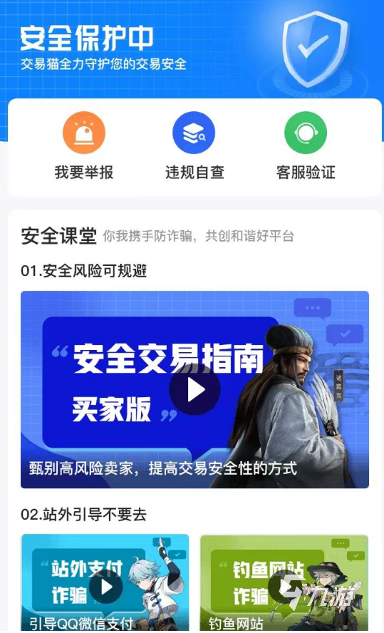 3、當(dāng)然,平臺(tái)為了加強(qiáng)大家的交易安全,也提供了安全保護(hù)中心。這里將有效幫助大家規(guī)避可能會(huì)出現(xiàn)在交易當(dāng)中的各類問(wèn)題,不太清楚的玩家也可以通過(guò)視頻教程來(lái)加強(qiáng)安全方面的意識(shí)。