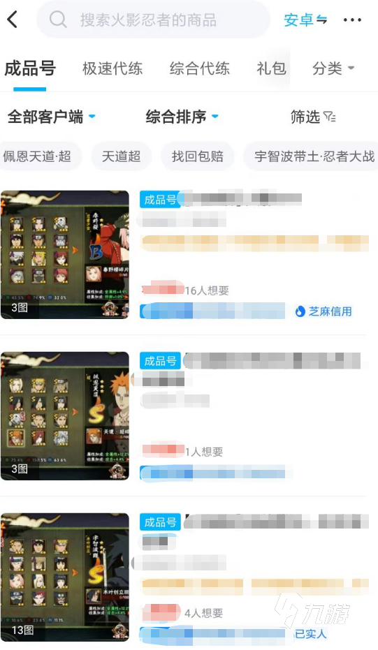 2、單獨(dú)的火影手游專區(qū)內(nèi),玩家可以隨時(shí)查看到各種感興趣的賬號(hào)交易信息。每一個(gè)賬號(hào)都會(huì)為大家展示真實(shí)的游戲截圖,幫助玩家們快速了解賬號(hào)內(nèi)包含了哪些道具和角色,從這些關(guān)鍵信息上來(lái)進(jìn)行判斷,將幫助玩家們?cè)诙虝r(shí)間內(nèi)解決自己購(gòu)買游戲號(hào)的問(wèn)題。