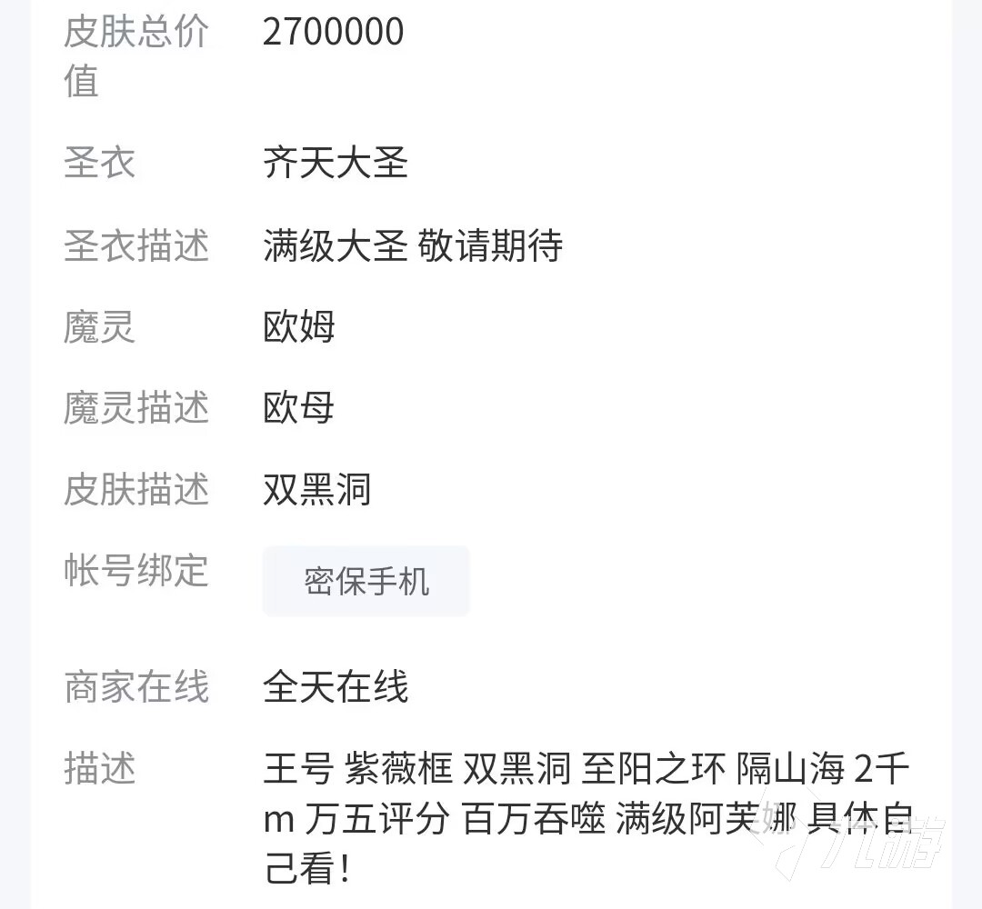 交易貓也考慮到大家在選購(gòu)賬號(hào)商品的時(shí)候,其實(shí)大多情況下還是很浪費(fèi)時(shí)間的,所以操作較為簡(jiǎn)潔的界面以及多個(gè)專區(qū)劃分可以讓大家更快更精準(zhǔn)的定位到符合要求的賬號(hào),點(diǎn)擊雙屏信息就能查看到商家對(duì)自己賬號(hào)所描述的皮膚總價(jià)值以及類似于金箍棒、先知無(wú)極還有滿級(jí)西瓜姑娘這種圣衣的信息,更方便對(duì)比的同時(shí)也能夠讓買(mǎi)家判斷出商家的標(biāo)價(jià)是否符合賬號(hào)的總價(jià)值。