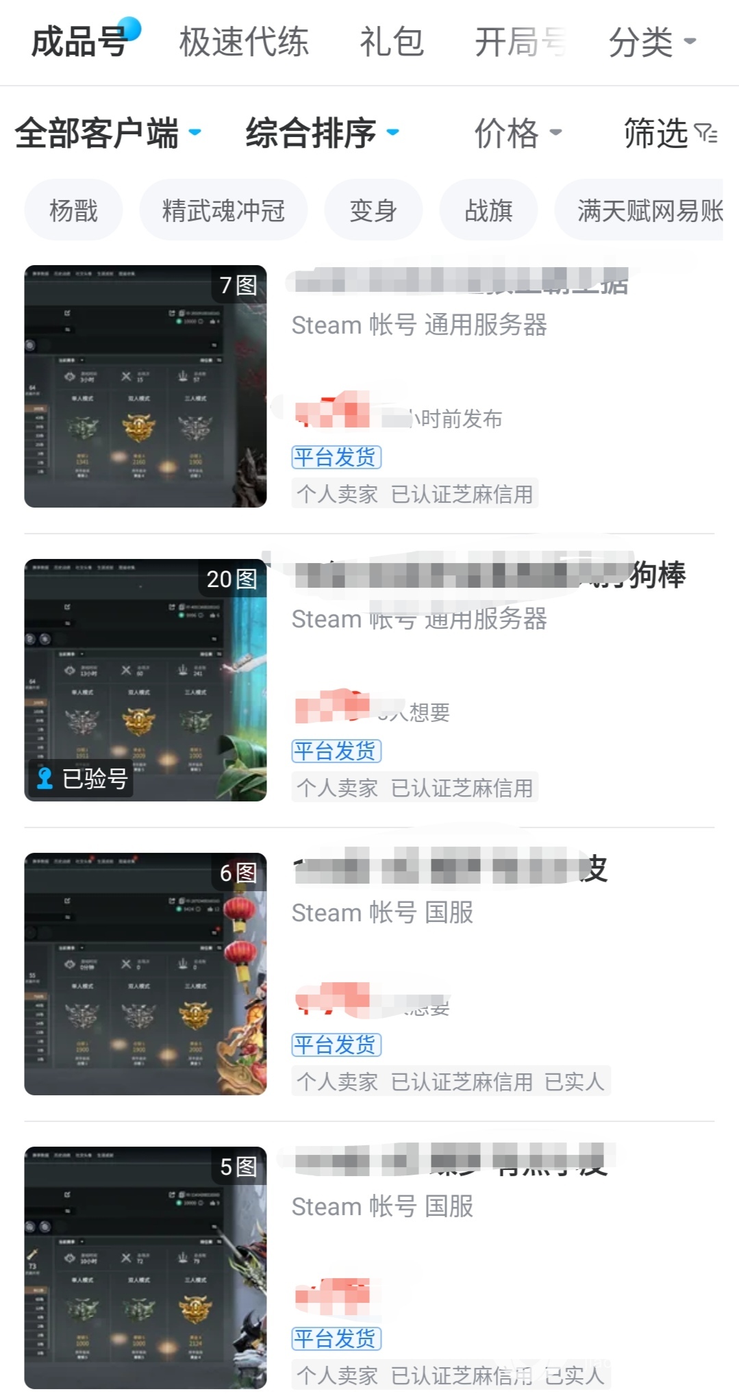 我們購買購買賬號(hào),除了有安全快捷兩個(gè)方面外,還需要平臺(tái)有充足的賬號(hào)儲(chǔ)備,如果只有那一兩個(gè)賬號(hào)可以買,且都不符合自己的心思,那購買賬號(hào)也就毫無意義了。在交易貓中有著充足的客戶數(shù)量,每個(gè)客戶都可以將自己的賬號(hào)進(jìn)行售賣,所以我們可以在交易貓當(dāng)中有足夠多的賬號(hào)進(jìn)行挑選,其中不乏有一些自抽號(hào),開局號(hào)等等,既便宜又安全,可以完全滿足我們對(duì)于賬號(hào)的需求。