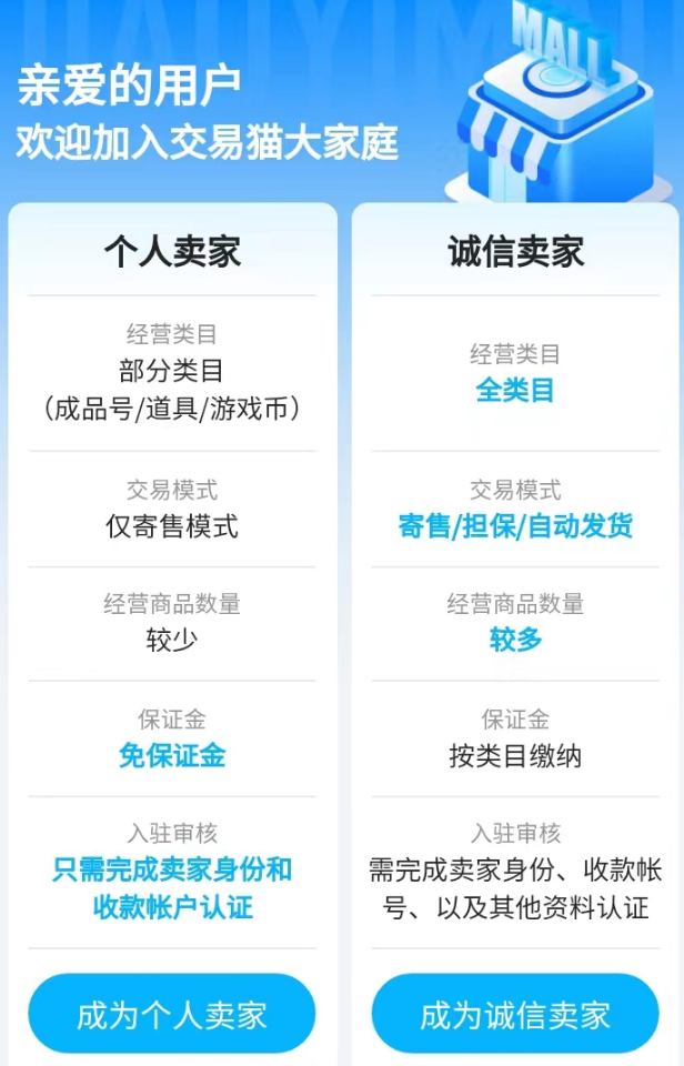 與其同時(shí),有玩家打算買號(hào)的話,自然也會(huì)有人將自己的游戲號(hào)進(jìn)行出售。而交易貓為了方便大家解決不同的賬號(hào)需求,也為玩家們提供了申請(qǐng)賣家身份的入口,各位可以根據(jù)實(shí)際情況來選擇合適的身份,完成平臺(tái)審核之后就可以輕松賣號(hào)了,而平臺(tái)大量活躍用戶,也會(huì)提高成交率。