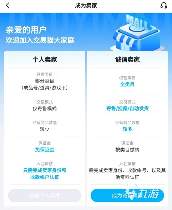 首先,我們需要安裝交易貓這個(gè)軟件并注冊(cè)登錄成為其用戶。然后就是賣家的認(rèn)證了,賣家有兩類,比較基礎(chǔ)的個(gè)人賣家只要填寫個(gè)人信息并綁定收款賬號(hào)就可以了。誠(chéng)信賣家還需要通過支付寶芝麻等級(jí)的認(rèn)證并繳納保證金,保證金只是在商品出售期間保障商品真實(shí)的一種手段,會(huì)在我們結(jié)束平臺(tái)的賣家身份時(shí)全款退還到我們綁定的收款賬號(hào)。所以,小編個(gè)人更推薦大家認(rèn)證為誠(chéng)信賣家,平臺(tái)不僅會(huì)加大誠(chéng)信賣家商品的推薦權(quán)重,而且在商品頁面還會(huì)有“優(yōu)質(zhì)賣家”的標(biāo)簽。同樣,對(duì)于買方而言,他們也認(rèn)為相比普通賣家,優(yōu)質(zhì)賣家提供的商品更真實(shí)可靠。平臺(tái)的推薦再加上買家的信任,可以大大加快我們商品的出售速度。