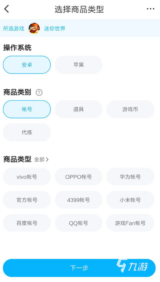 1、各位可以直接在選擇商品類型的界面當(dāng)中,觀察目前交易貓所支持的賬號類型。此時各位就可以很明顯的觀察到oppo賬號的選項(xiàng),所以在接下來的賬號出售環(huán)節(jié),大家只需要勾選好相關(guān)的賬號類型就行了。