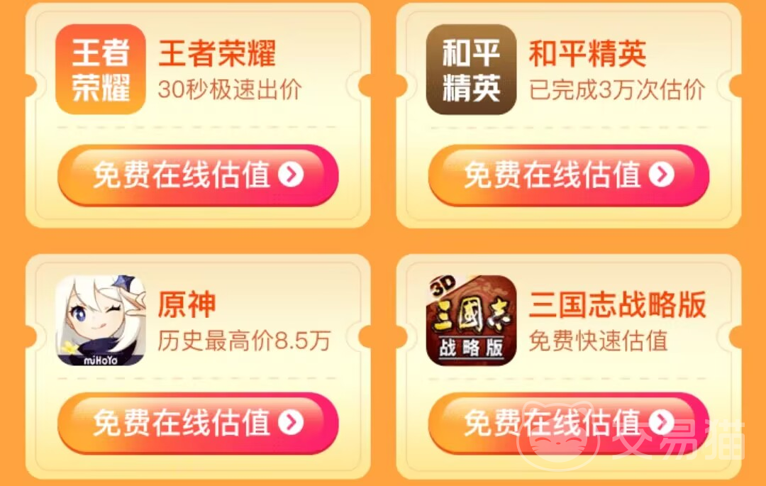 在交易貓上,大家可以找到自己想要的三國殺十周年賬號的交易板塊兒。同時他還有王者榮耀,和平精英,三國志等熱門游戲賬號的交易,對于這幾款比較熱門的游戲賬號還提供了免費的價值估值服務。對于那些想要購買或者是出售這幾款游戲賬號的小伙伴來說是非常好用的??梢酝ㄟ^他提供的的這幾個熱門游戲賬號的價值估值服務,獲得自己游戲賬號的真實價值信息。