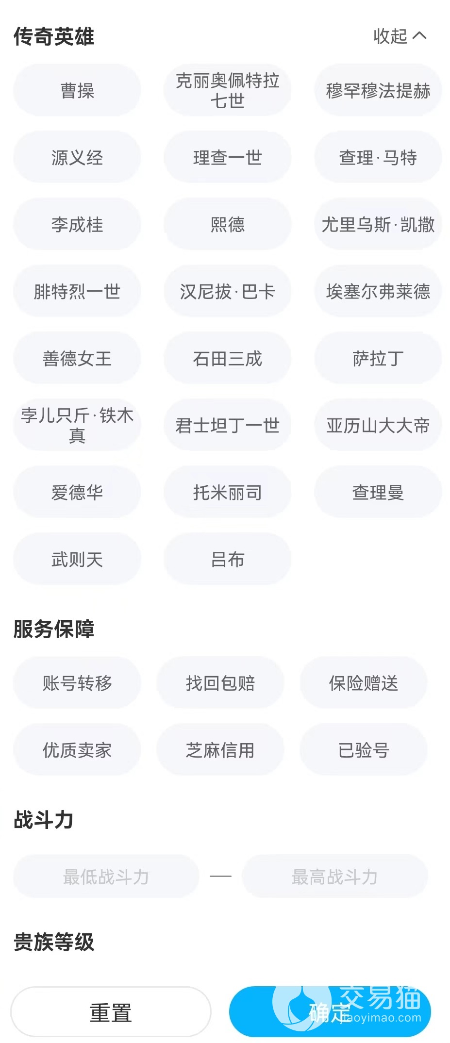 交易貓對萬國覺醒中最有價(jià)值的部分進(jìn)行了充分展現(xiàn),這一點(diǎn)在上架時(shí)和賬號購買篩選時(shí)都能得到體現(xiàn)。在篩選時(shí)可以直接選擇價(jià)格范圍、賬號內(nèi)的傳奇英雄、服務(wù)保障、戰(zhàn)斗力區(qū)間、貴族等級區(qū)間等進(jìn)行充分的篩選,滿足不同的需要。