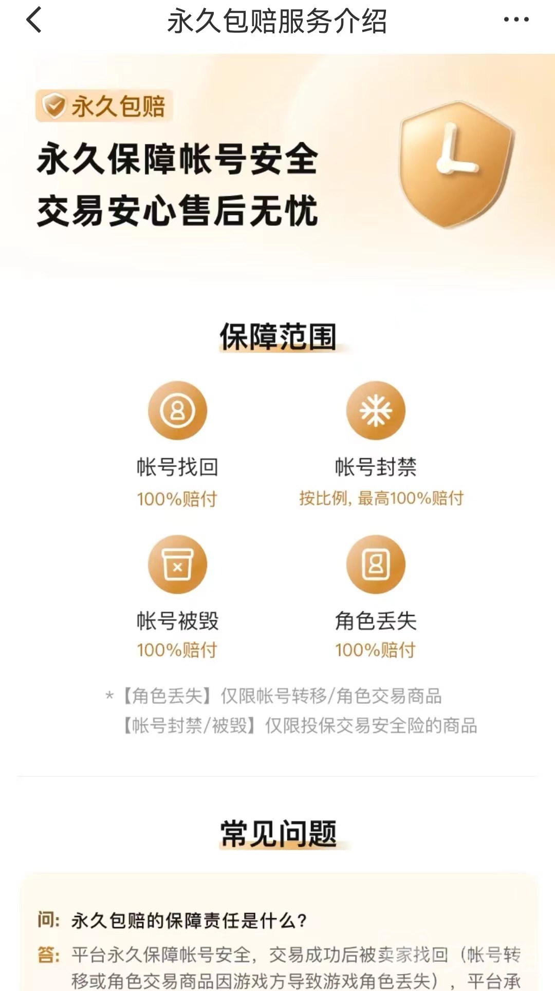 交易貓還有很多人性化的相關(guān)購買服務(wù),永久包賠服務(wù)在最大程度上保障用戶玩家的交易,安心交易保證售后無憂,玩家可享受永久包賠的多種服務(wù),賬號密碼丟失也能夠百分百找回賠付,承諾安心暢玩所購游戲資源。