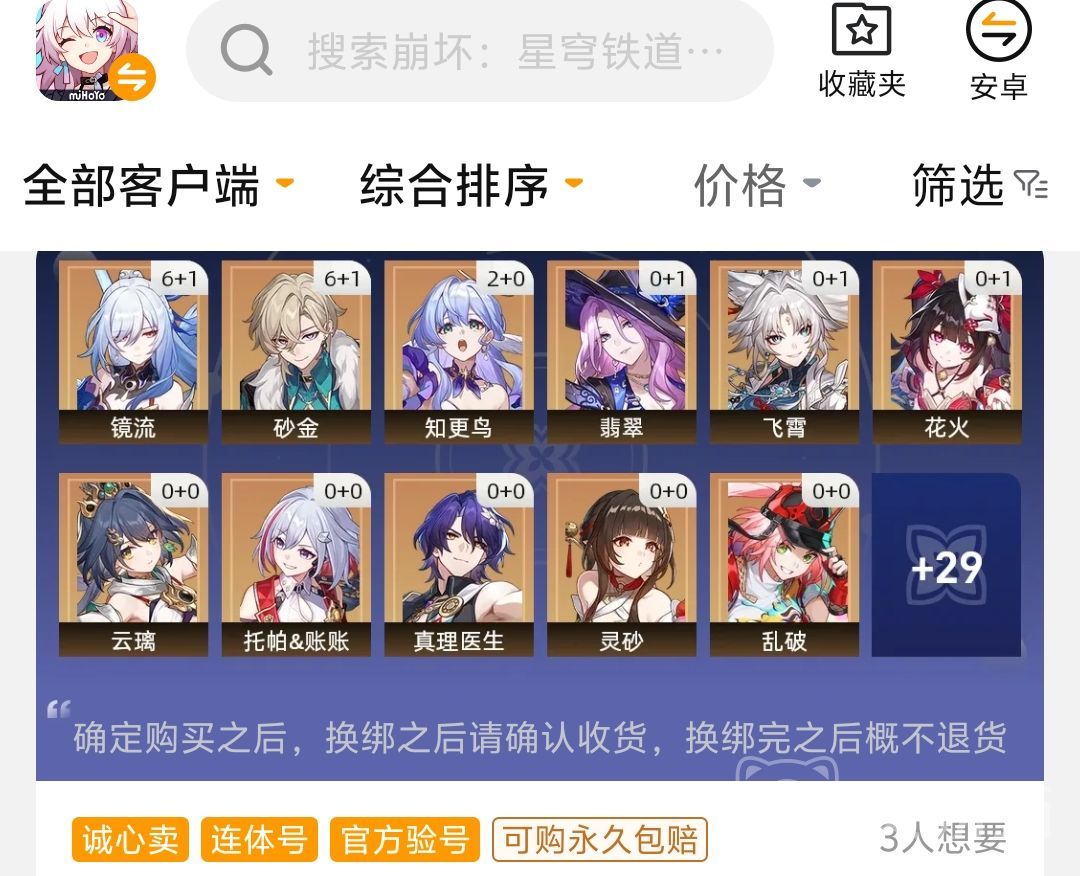 安卓用戶直接點(diǎn)擊上方鏈接就可以安裝交易貓,蘋果用戶可以前往交易貓官網(wǎng)登錄使用。星穹鐵道作為米哈游的二把手,在出售賬號的時候首先要考慮有沒有同時玩的其他游戲,因?yàn)樾邱疯F道賬號一出就會連帶著這些游戲一同出手,其次就是要賣個合適的價格來回回血,也就是對賬號做一個整體的估價。