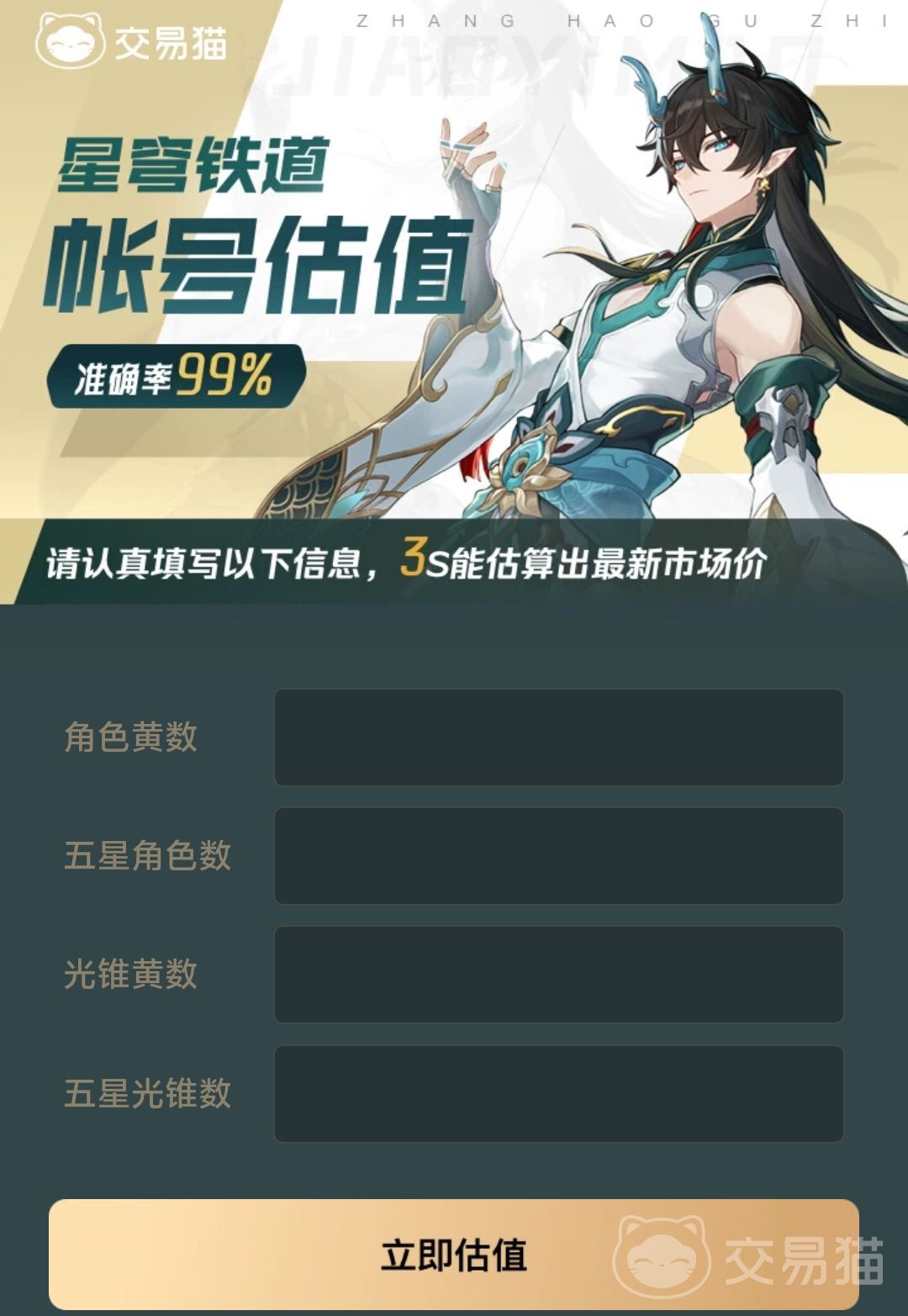 交易貓平臺針對熱門的12款游戲創(chuàng)建了一個三秒評估賬號最新市場價的功能,崩壞星穹鐵道就在內(nèi)。使用這個功能就是要輸入游戲內(nèi)的角色黃數(shù)、五星角色數(shù)、光錐黃數(shù)和五星光錐數(shù),然后點(diǎn)擊立即估值就可以獲得一個準(zhǔn)確的估值范圍,這個功能能夠讓賣家對自己的賬號價值有一個較為大概的定位,不至于賣的太貴無人問津。