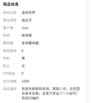 在賬號信息上,交易貓平臺做到了最細致的游戲分類,平臺根據(jù)每種游戲的特性做出了獨立的介紹模板,如客戶端、等級、性別、戰(zhàn)斗力等等,這些詳細的信息可以讓買家更好的了解賬號,加快了賬號交易的效率。