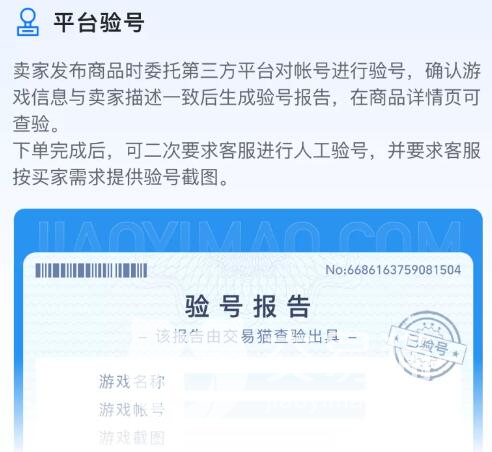 對此,小編建議大家可以嘗試以下這個名叫【交易貓】的游戲賬號交易平臺。在這個平臺中,有一個十分好用的功能,叫做驗號。顧名思義,該功能就是為了幫助買家在購買游戲賬號時,檢驗游戲賬號與賣家展示的賬號是否具有一致性的。在大家找到心儀的游戲賬號,并且準備購買的之前,一定不要忘了使用該功能。