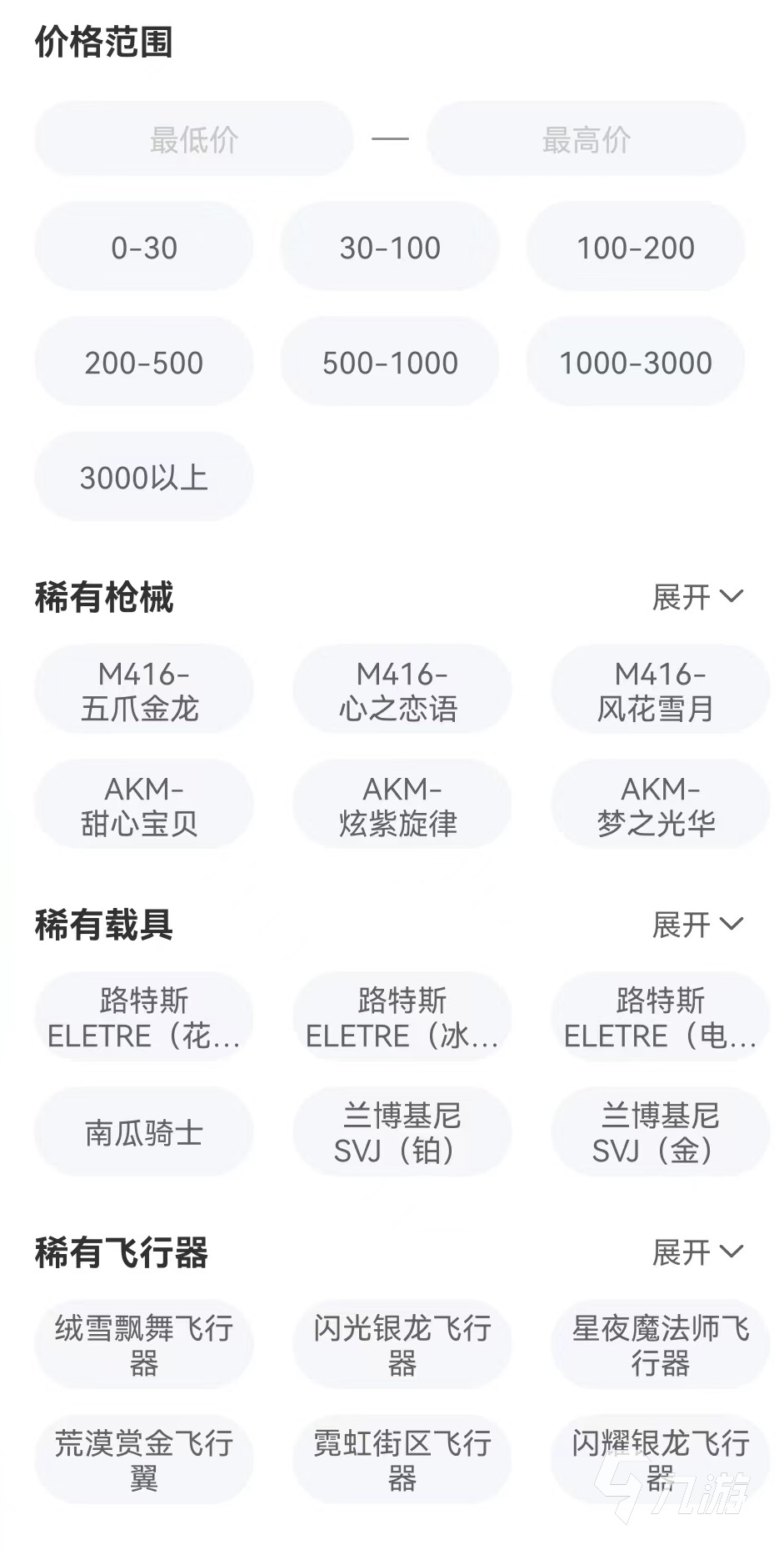 在和平精英中擁有數(shù)量非常多的皮膚涵蓋了各個類型,如果逐個賬號去查看那將消耗大量的時間也不切實記。在交易貓平臺的和平精英出售專區(qū)里,可以通過精準的篩選服務(wù)來尋找自己需要的內(nèi)容。因為賬號中的皮膚是和價值最相關(guān)的道具,所以在篩選中將稀有槍械,稀有載具和稀有飛行器逐個展現(xiàn)了出來,通過點擊選擇的方式就能進行篩選,選擇完畢后,所呈現(xiàn)在眼前的就是所有符合要求的內(nèi)容。如果對其他方面沒有要求,那就直接通過價格排序?qū)⒆畋阋说恼页鰜恚褪欠弦蟮哪且豢睢?/p>