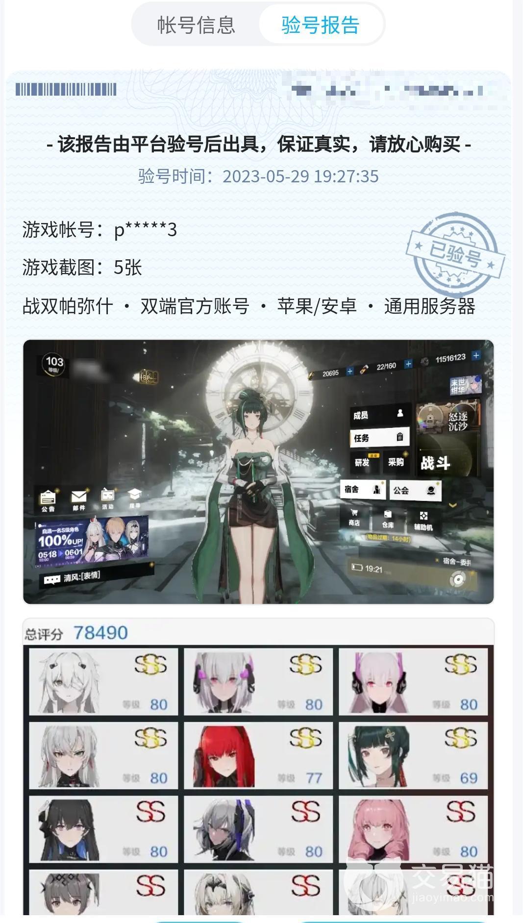如果小伙伴們碰到了自己感興趣的戰(zhàn)雙帕彌什游戲賬號,可以點進去更加細致的了解,圖中戰(zhàn)雙帕彌什的小伙伴們可以看見,賬號交易貓平臺是驗過了的,也出具了對應(yīng)的驗號證明,所以賬號是真實的,做不了假的,官方不會開具假證明。除了證明以外小伙伴們還可以看見戰(zhàn)雙帕彌什游戲賬號內(nèi)都有哪些角色,以便于自己選擇。